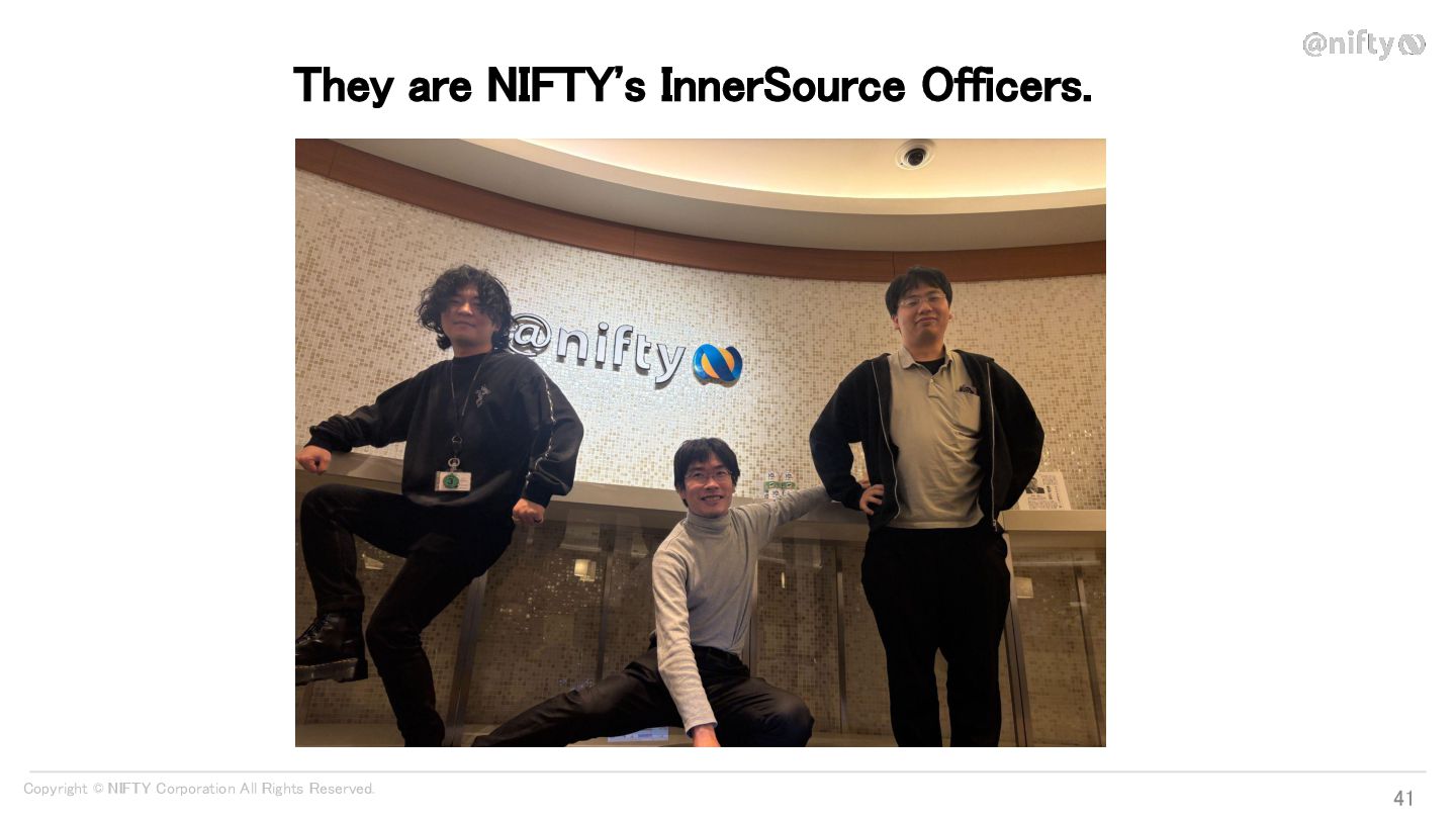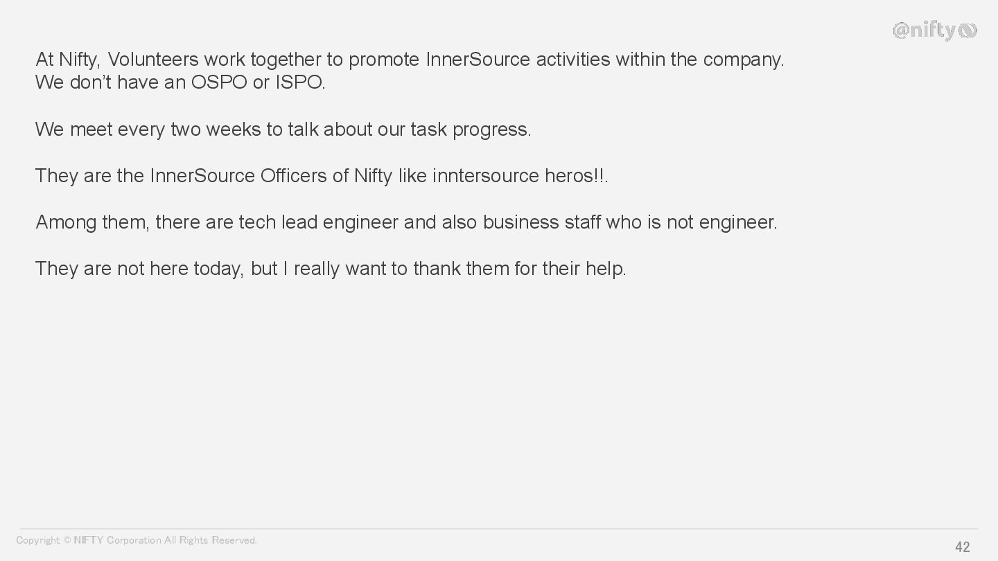 Nifty, Volunteers work together to promote InnerSource activities within the company. We don’t have an OSPO or ISPO. We meet every two weeks to talk about our task progress. They are the InnerSource Officers of Nifty like inntersource heros!!. Among them, there are tech lead engineer and also business staff who is not engineer. They are not here today, but I really want to thank them for their help.