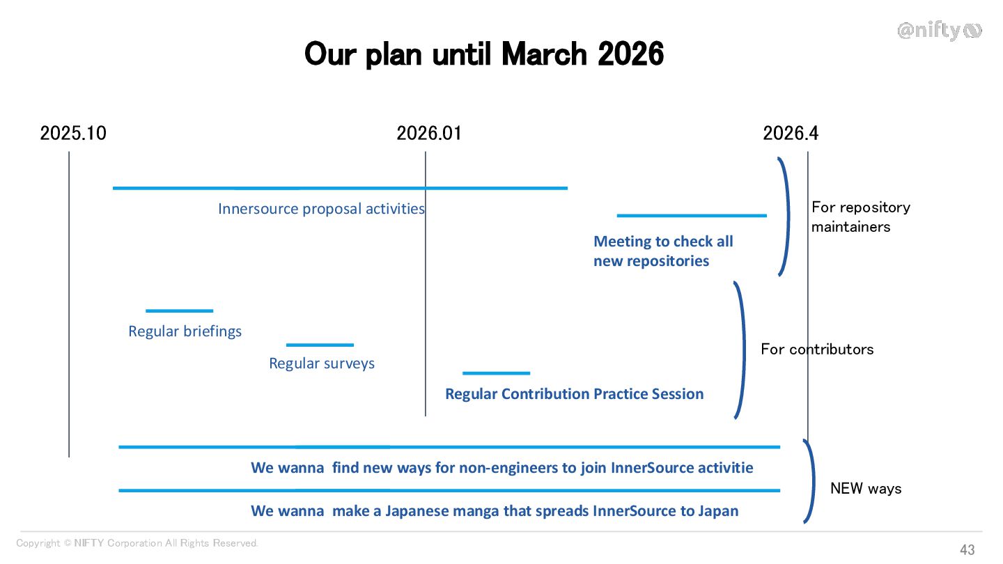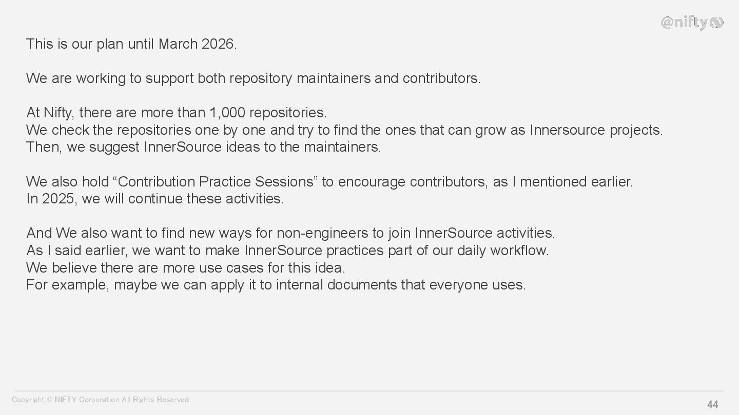 is our plan until March 2026. We are working to support both repository maintainers and contributors. At Nifty, there are more than 1,000 repositories. We check the repositories one by one and try to find the ones that can grow as Innersource projects. Then, we suggest InnerSource ideas to the maintainers. We also hold “Contribution Practice Sessions” to encourage contributors, as I mentioned earlier. In 2025, we will continue these activities. And We also want to find new ways for non-engineers to join InnerSource activities. As I said earlier, we want to make InnerSource practices part of our daily workflow. We believe there are more use cases for this idea. For example, maybe we can apply it to internal documents that everyone uses.