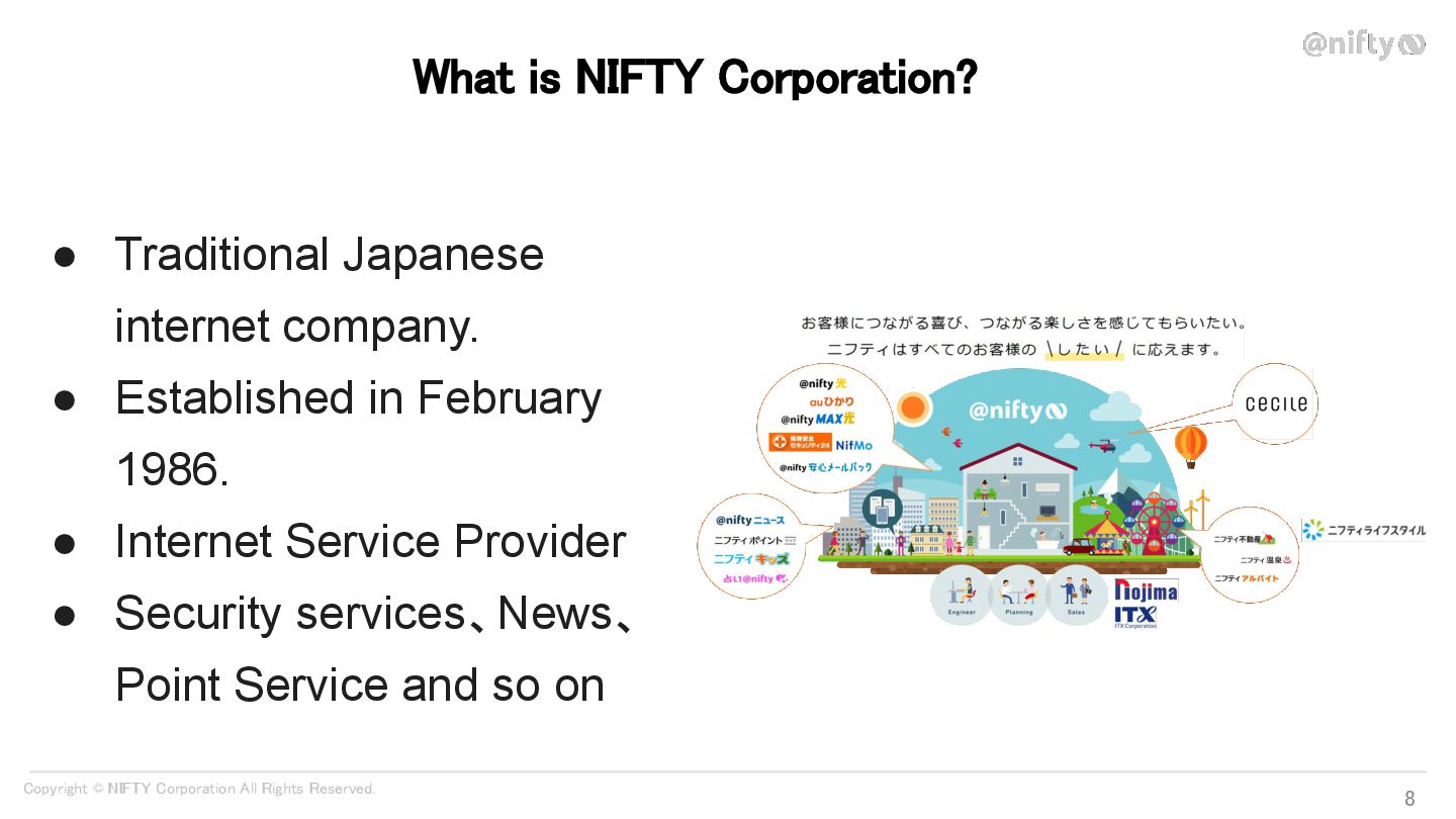 is NIFTY Corporation? • Traditional Japanese internet company. • Established in February 1986. • Internet Service Provider • Security services、News、 Point Service and so on