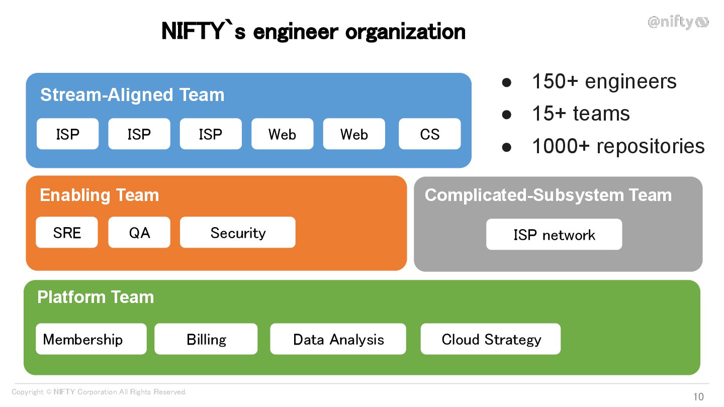Team ISP ISP ISP Web Web CS Enabling Team SRE QA Security Complicated-Subsystem Team ISP network Platform Team Membership Billing Data Analysis Cloud Strategy NIFTY`s engineer organization • 150+ engineers • 15+ teams • 1000+ repositories