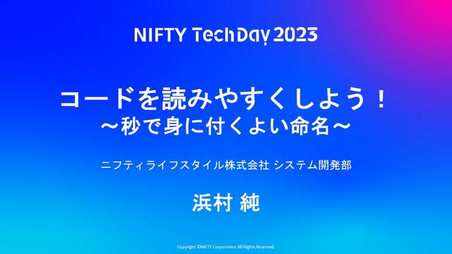 Copyright ©NIFTY Corporation All Rights Reserved. コードを読みやすくしよう! 〜秒で身に付くよい命名〜 ニフティライフスタイル株式会社 システム開発部