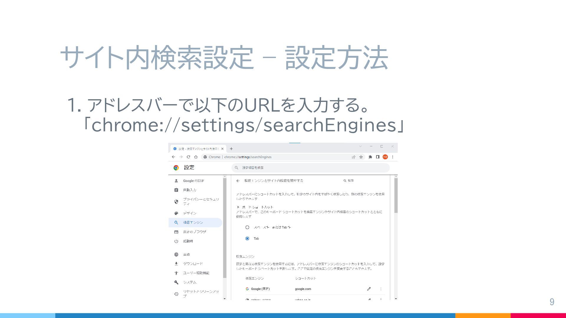 サイト内検索設定 – 設定方法 1. アドレスバーで以下のURLを入力する。 「chrome://settings/searchEngines」 9