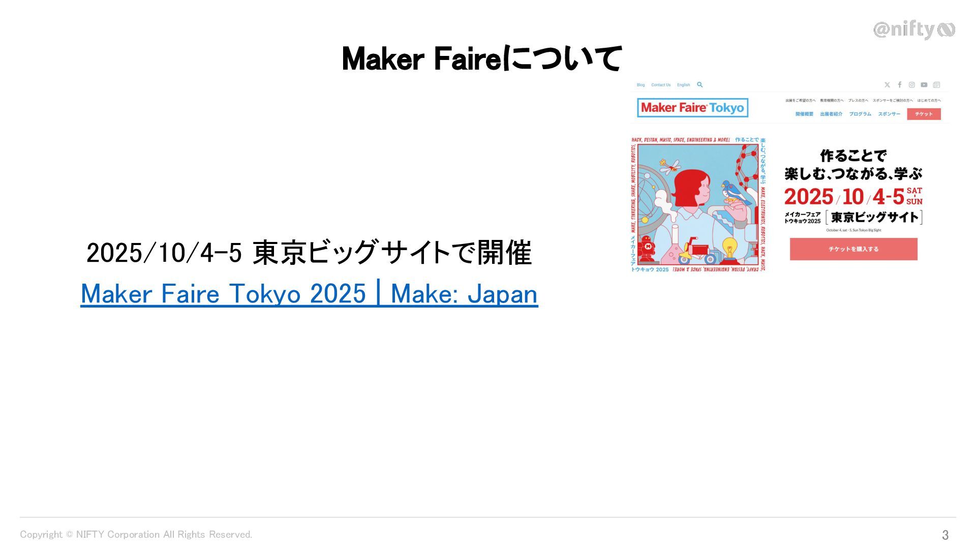イベント Maker Faire Tokyo 2025 After - NIFTY Tech Talk #25 https://nifty.connpass.com/event/374440/