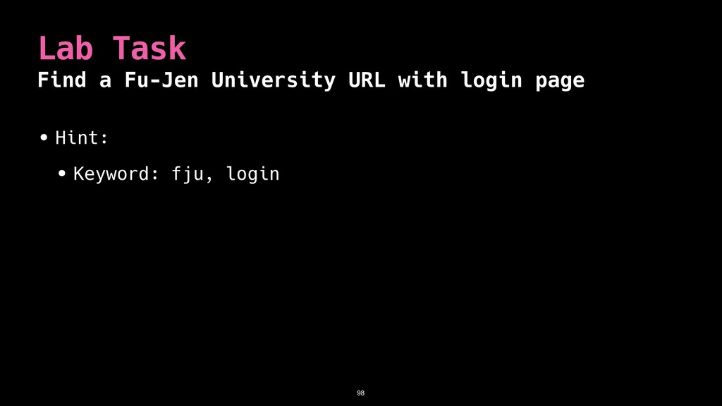 of file extensions intitle • Used to search for various keywords inside the title intext • Useful to locate pages that contain certain characters or strings inside their text 97