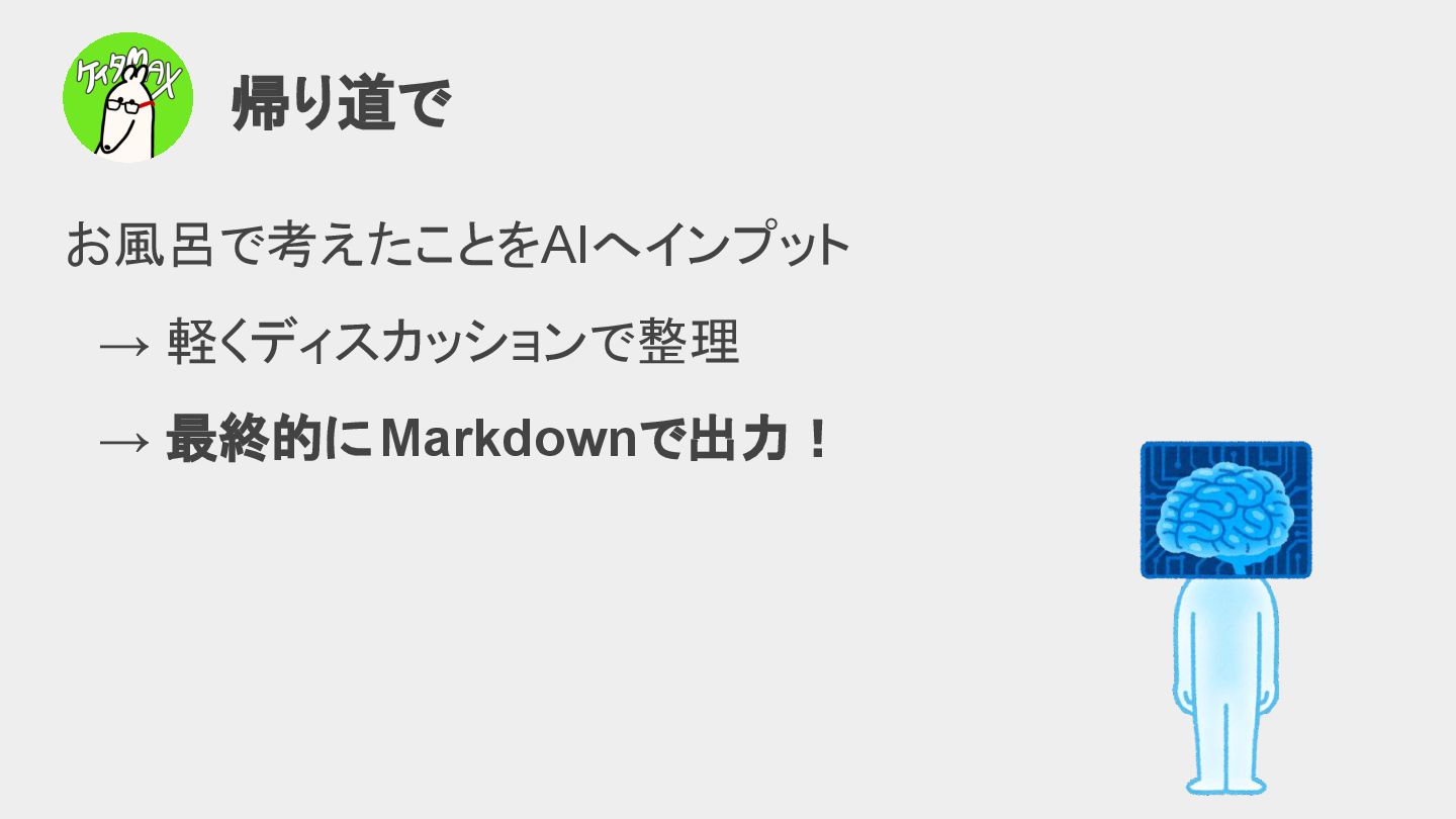 帰り道で お風呂で考えたことをAIへインプット → 軽くディスカッションで整理 → 最終的にMarkdownで出力!