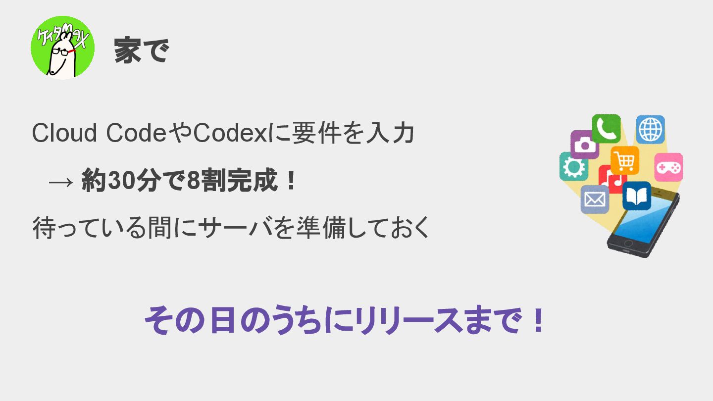 家で Cloud CodeやCodexに要件を入力 → 約30分で8割完成! 待っている間にサーバを準備しておく その日のうちにリリースまで!