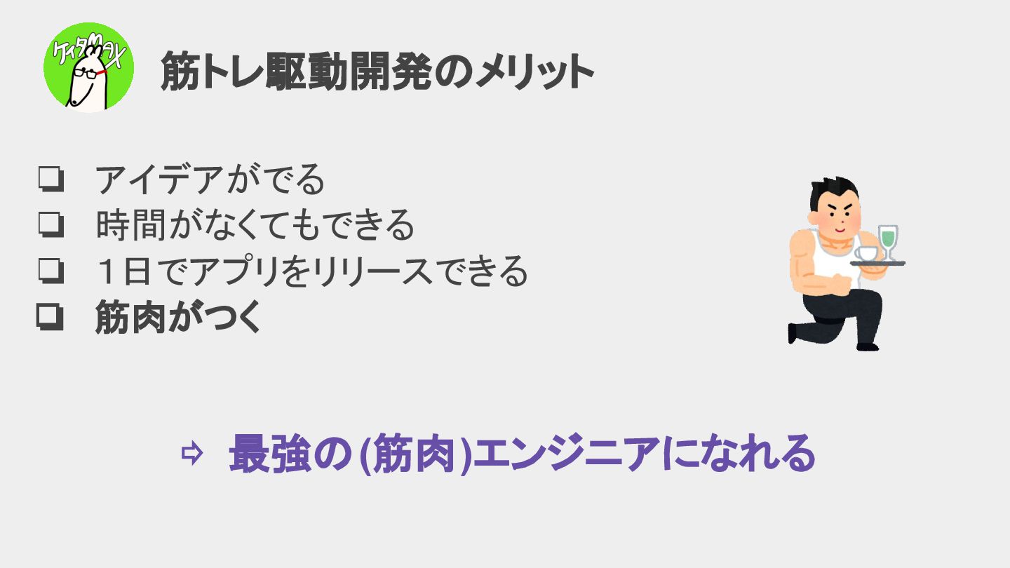 筋トレ駆動開発のメリット ❏ アイデアがでる ❏ 時間がなくてもできる ❏ 1日でアプリをリリースできる ❏ 筋肉がつく ⇨