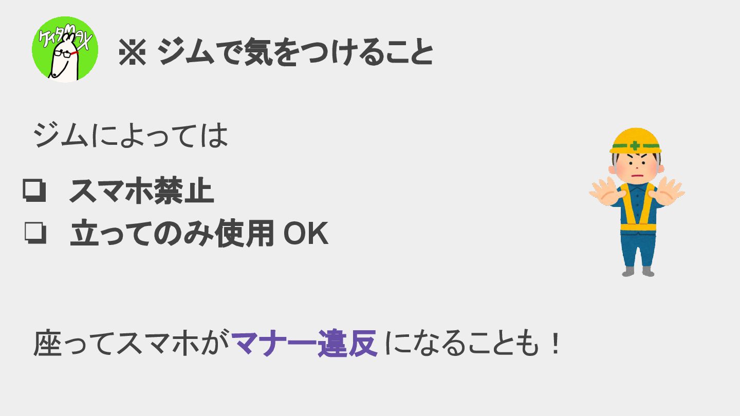 ※ ジムで気をつけること ジムによっては ❏ スマホ禁止 ❏ 立ってのみ使用 OK 座ってスマホがマナー違反 になることも!