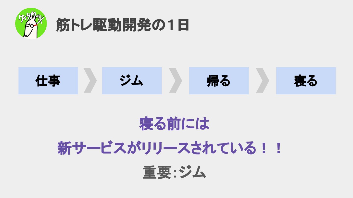筋トレ駆動開発の1日 仕事 ジム 帰る 寝る 寝る前には 新サービスがリリースされている!! 重要:ジム