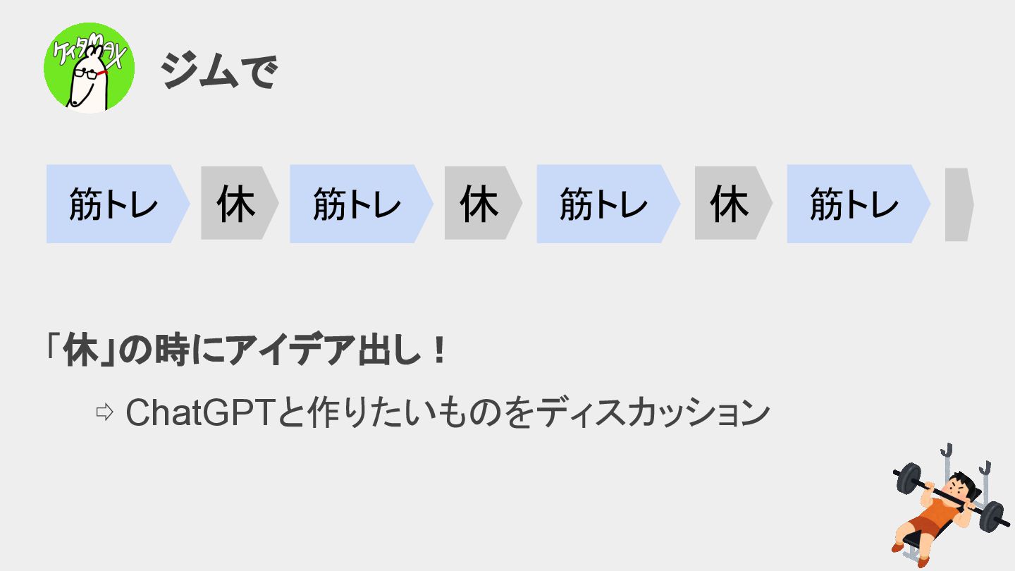 ジムで 筋トレ 休 休 休 筋トレ 筋トレ 筋トレ 「休」の時にアイデア出し! ⇨