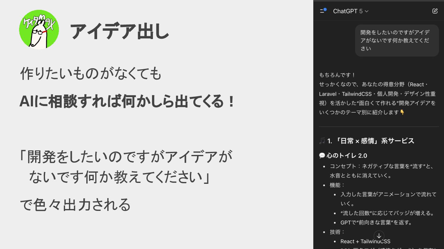アイデア出し 作りたいものがなくても AIに相談すれば何かしら出てくる! 「開発をしたいのですがアイデアが ないです何か教えてください」 で色々出力される