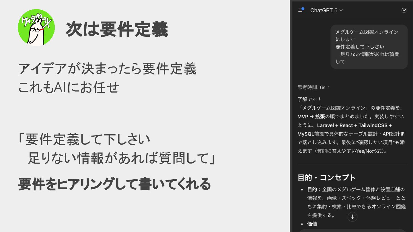 次は要件定義 アイデアが決まったら要件定義 これもAIにお任せ 「要件定義して下しさい 足りない情報があれば質問して」 要件をヒアリングして書いてくれる