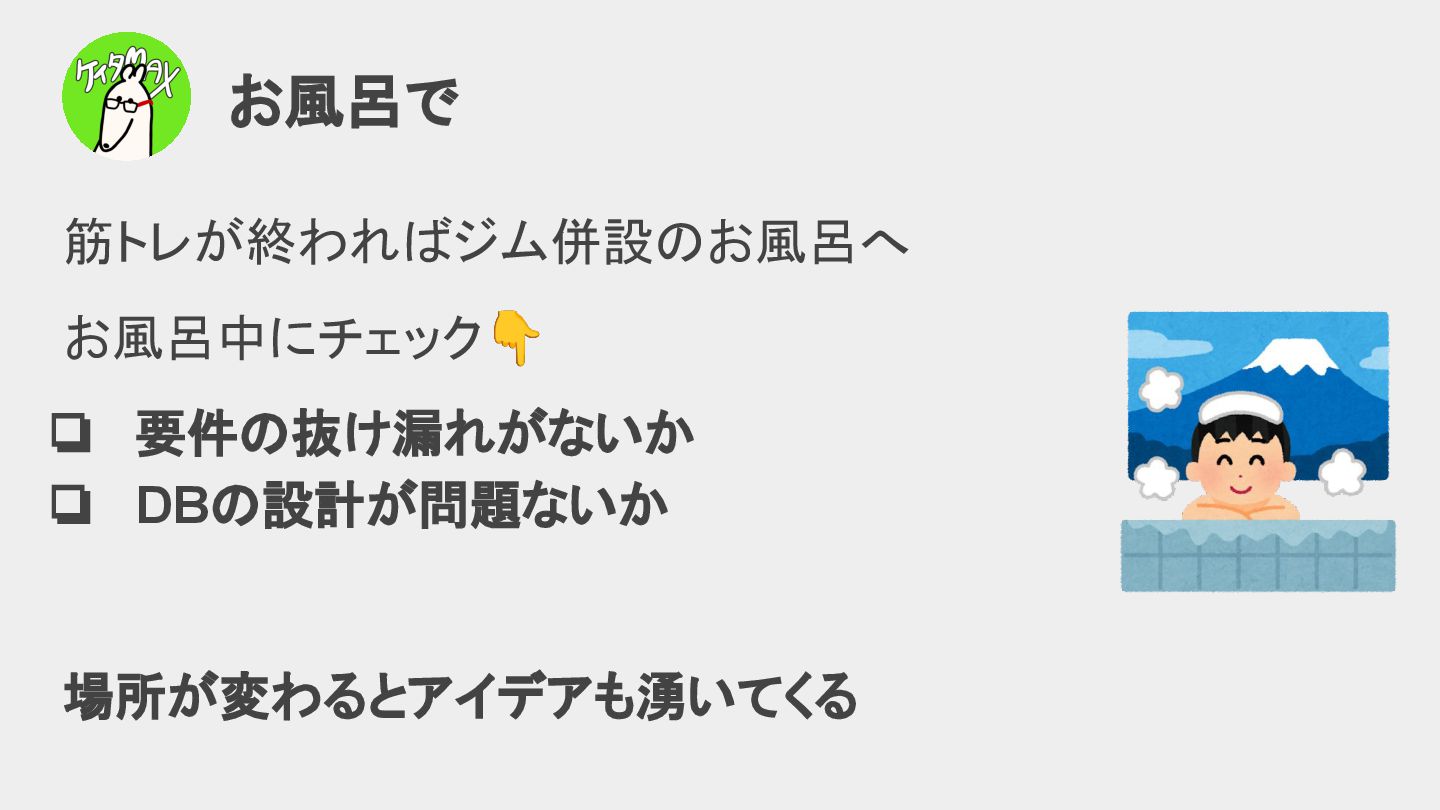お風呂で 筋トレが終わればジム併設のお風呂へ お風呂中にチェック👇 ❏ 要件の抜け漏れがないか ❏ DBの設計が問題ないか 場所が変わるとアイデアも湧いてくる