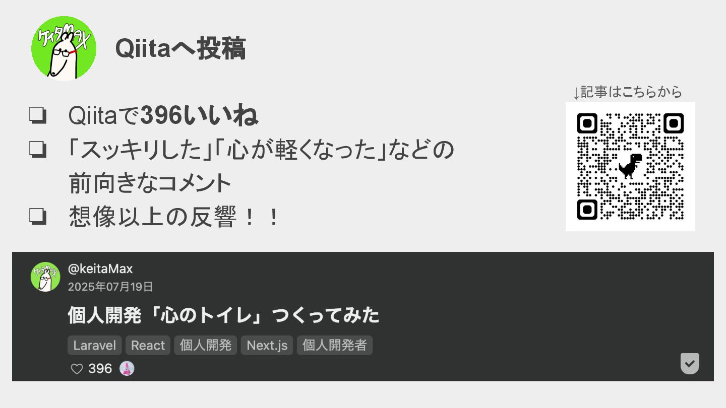 Qiitaへ投稿 ❏ Qiitaで396いいね ❏ 「スッキリした」「心が軽くなった」などの 前向きなコメント ❏ 想像以上の反響!! ↓記事はこちらから