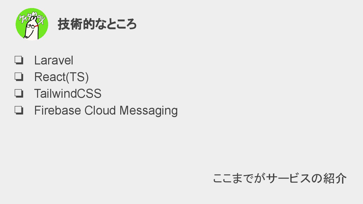 技術的なところ ❏ Laravel ❏ React(TS) ❏ TailwindCSS ❏ Firebase Cloud
