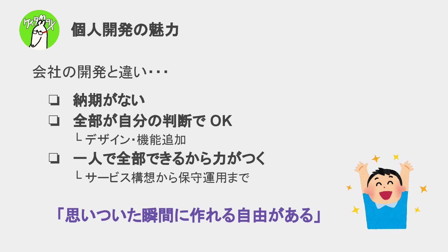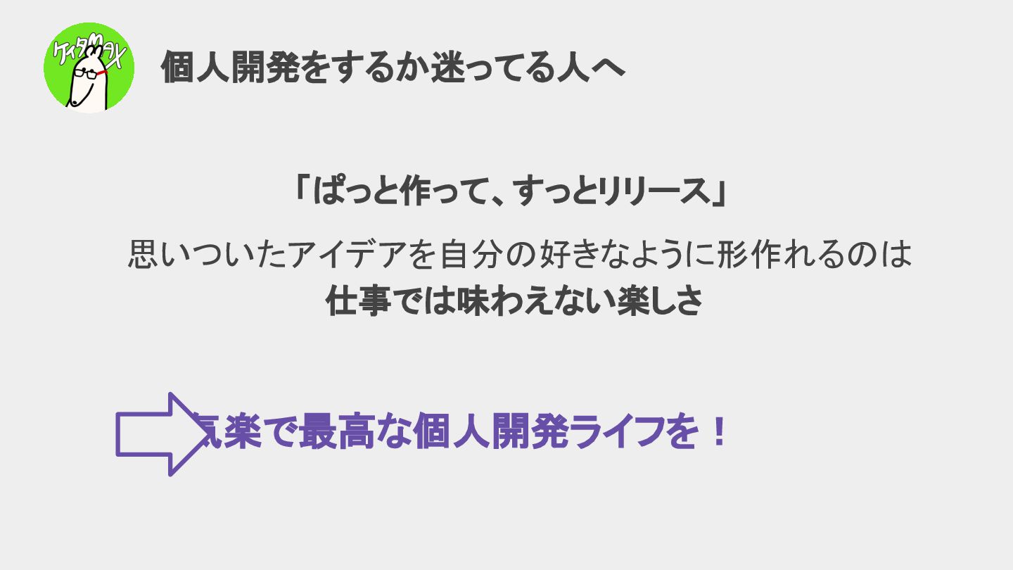 個人開発をするか迷ってる人へ 「ぱっと作って、すっとリリース」 思いついたアイデアを自分の好きなように形作れるのは 仕事では味わえない楽しさ 気楽で最高な個人開発ライフを!