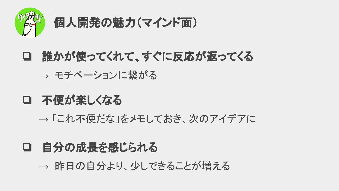 個人開発の魅力(マインド面) ❏ 誰かが使ってくれて、すぐに反応が返ってくる → モチベーションに繋がる ❏ 自分の成長を感じられる → 昨日の自分より、少しできることが増える ❏