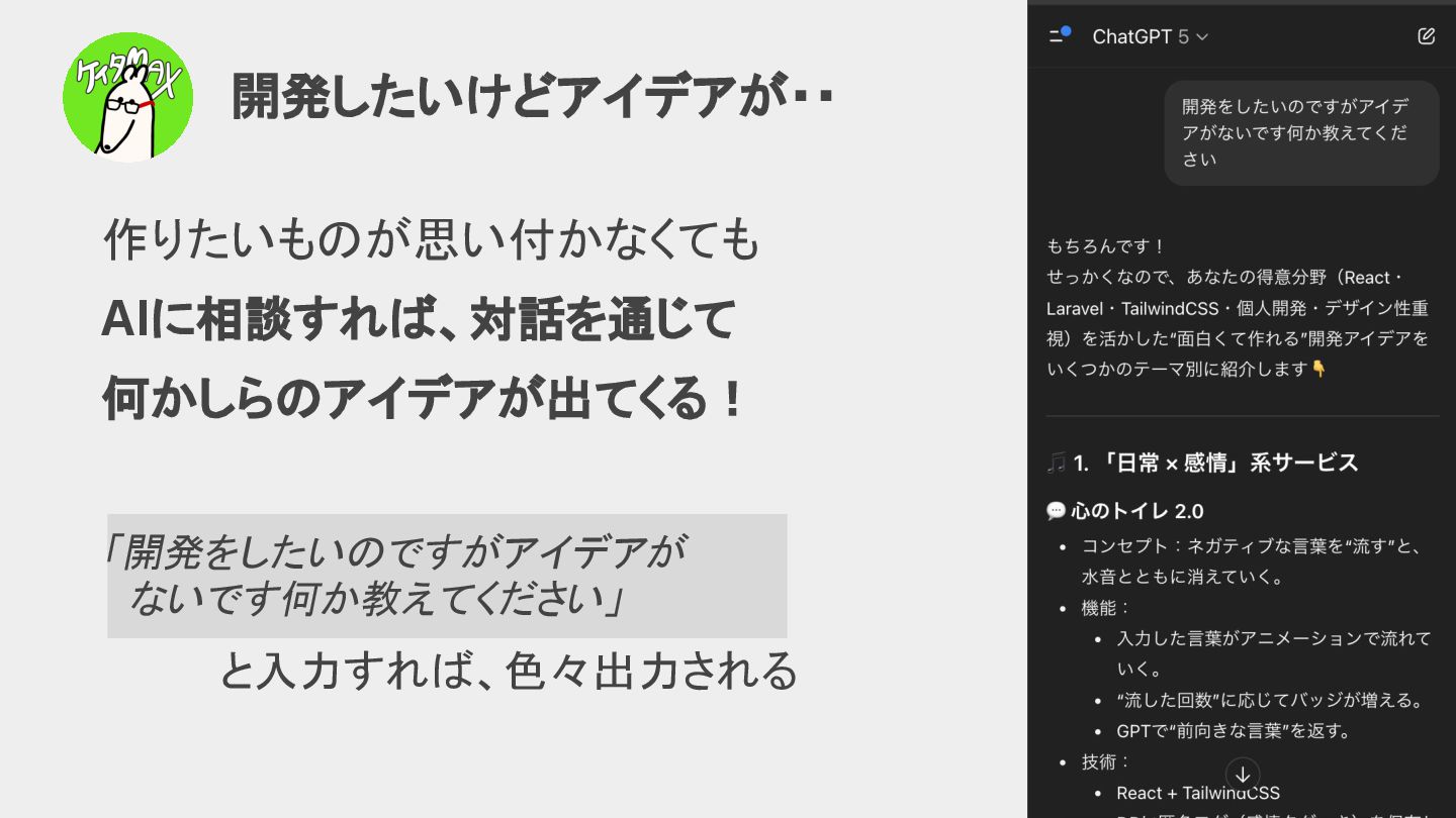 開発したいけどアイデアが・・ 作りたいものが思い付かなくても AIに相談すれば、対話を通じて 何かしらのアイデアが出てくる! 「開発をしたいのですがアイデアが ないです何か教えてください」 と入力すれば、色々出力される