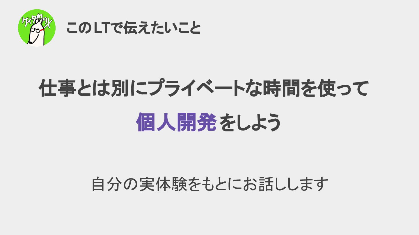 このLTで伝えたいこと 仕事とは別にプライベートな時間を使って 個人開発をしよう 自分の実体験をもとにお話しします