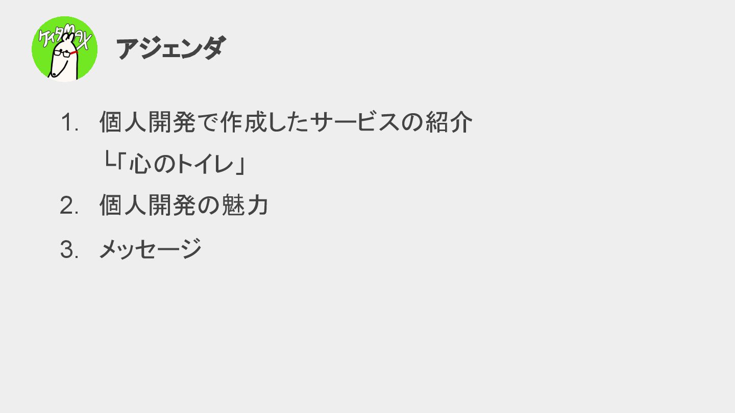アジェンダ 1. 個人開発で作成したサービスの紹介 └「心のトイレ」 2. 個人開発の魅力 3. メッセージ