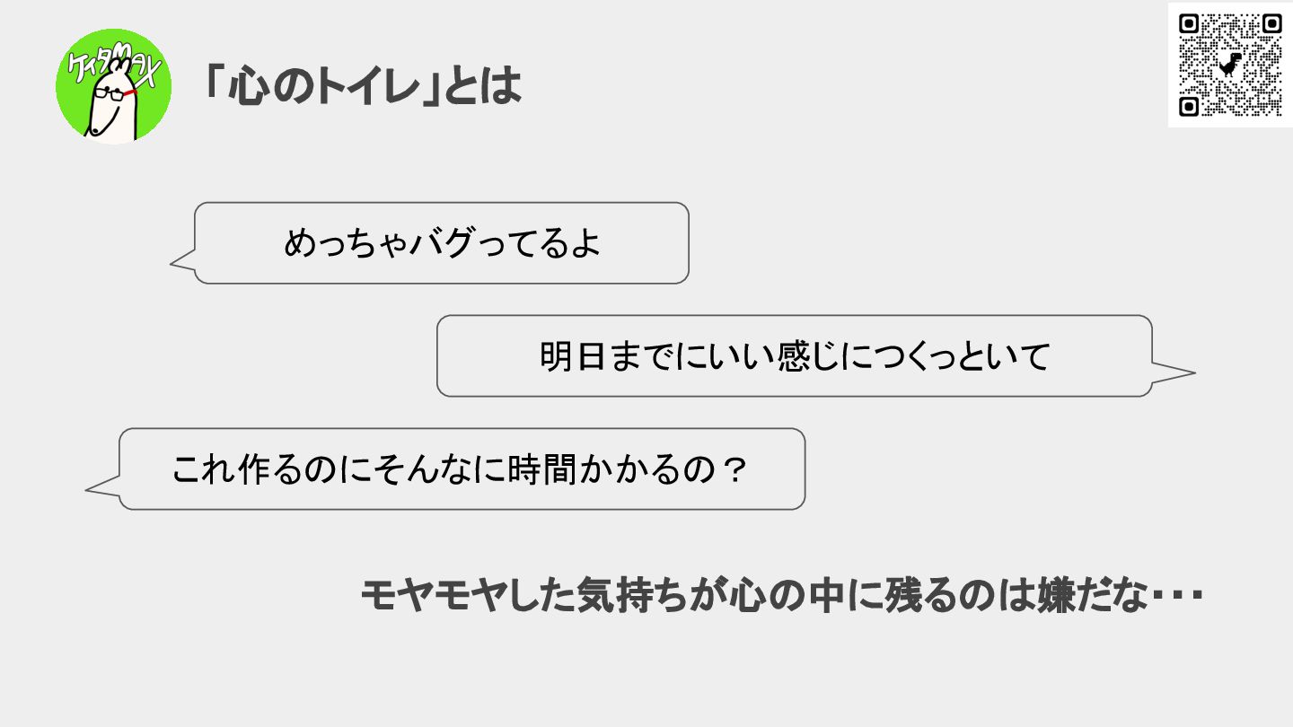 「心のトイレ」とは モヤモヤした気持ちが心の中に残るのは嫌だな・・・ 明日までにいい感じにつくっといて めっちゃバグってるよ これ作るのにそんなに時間かかるの?