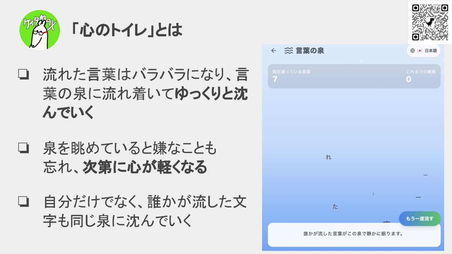 「心のトイレ」とは ❏ 流れた言葉はバラバラになり、言 葉の泉に流れ着いてゆっくりと沈 んでいく ❏ 泉を眺めていると嫌なことも 忘れ、次第に心が軽くなる ❏ 自分だけでなく、誰かが流した文