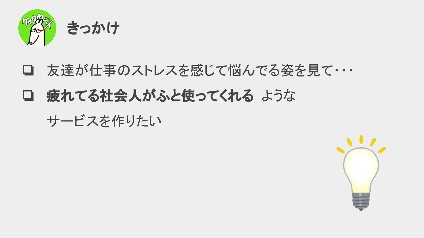 きっかけ ❏ 友達が仕事のストレスを感じて悩んでる姿を見て・・・ ❏ 疲れてる社会人がふと使ってくれる ような サービスを作りたい