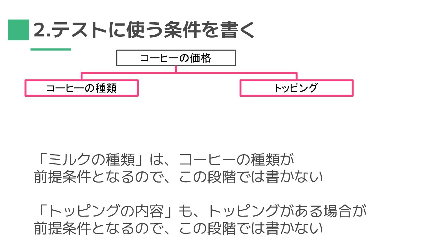 2.テストに使う条件を書く コーヒーの価格 コーヒーの種類 トッピング 「ミルクの種類」は、コーヒーの種類が 前提条件となるので、この段階では書かない 「トッピングの内容」も、トッピングがある場合が 前提条件となるので、この段階では書かない