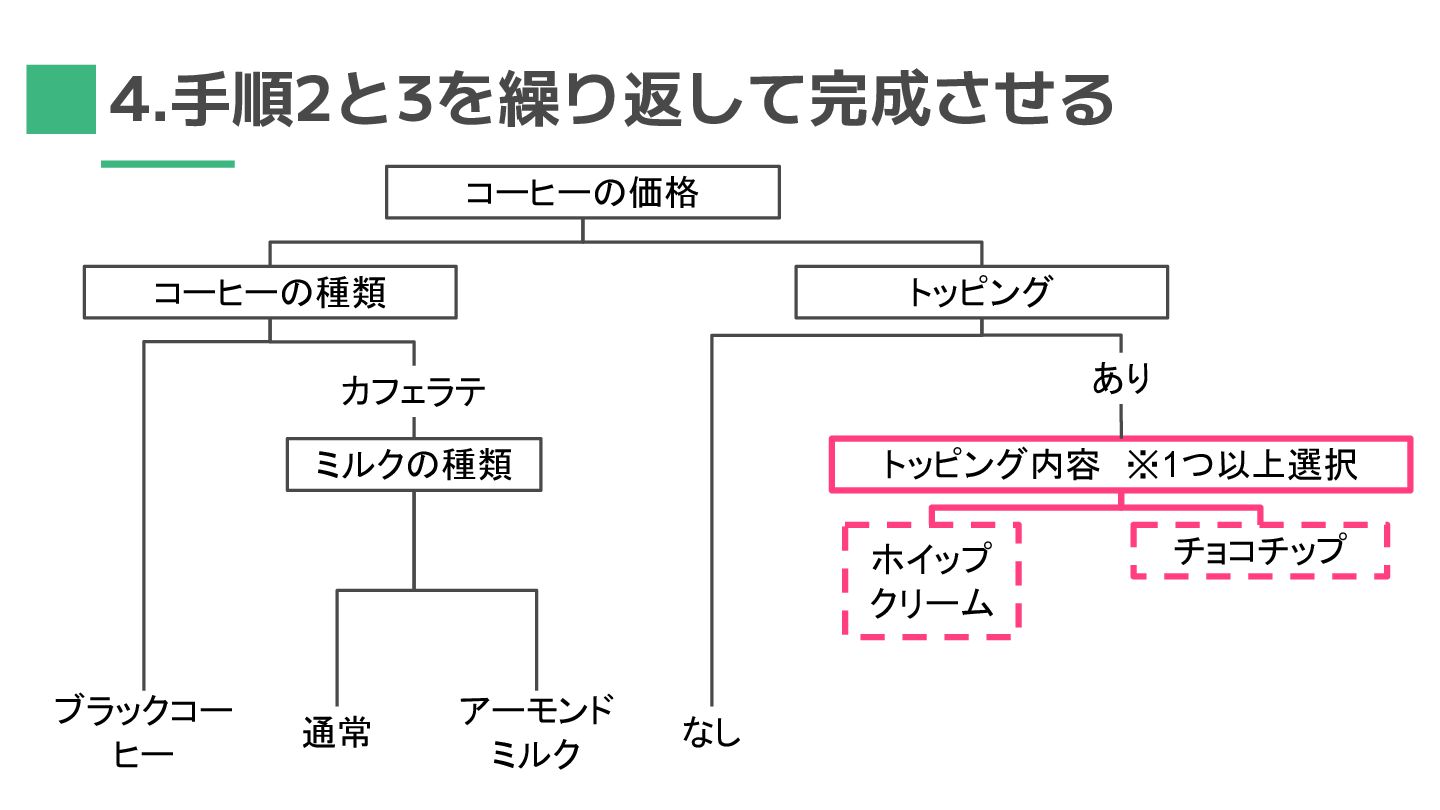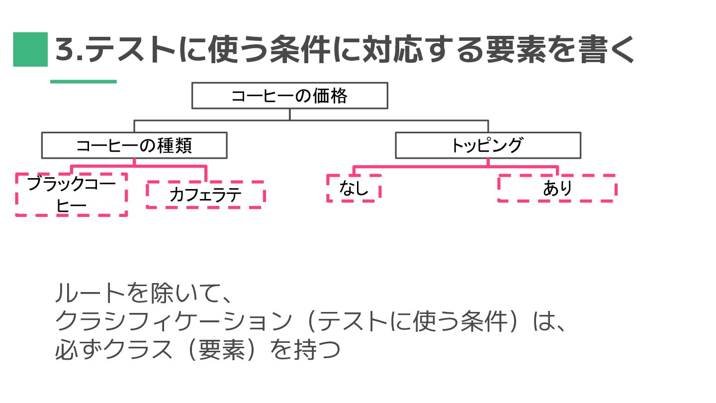 3.テストに使う条件に対応する要素を書く コーヒーの価格 コーヒーの種類 ブラックコー ヒー カフェラテ トッピング なし あり ルートを除いて、