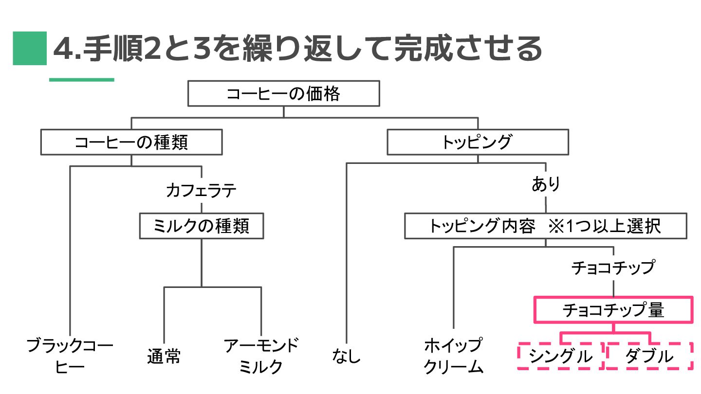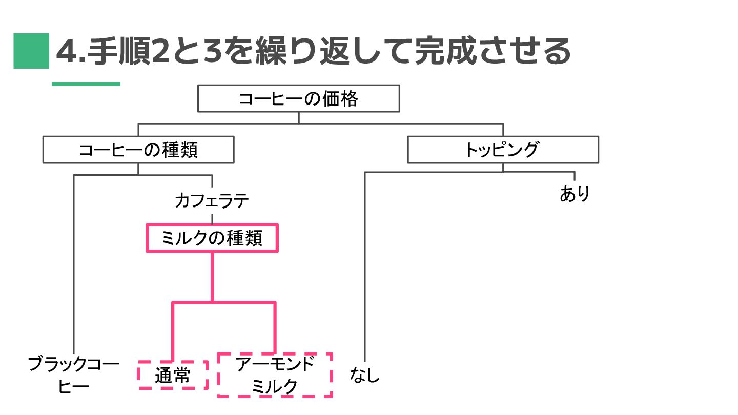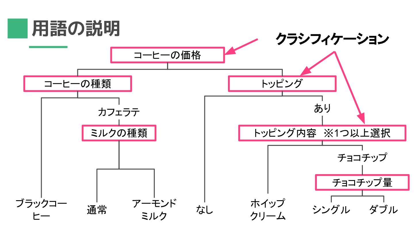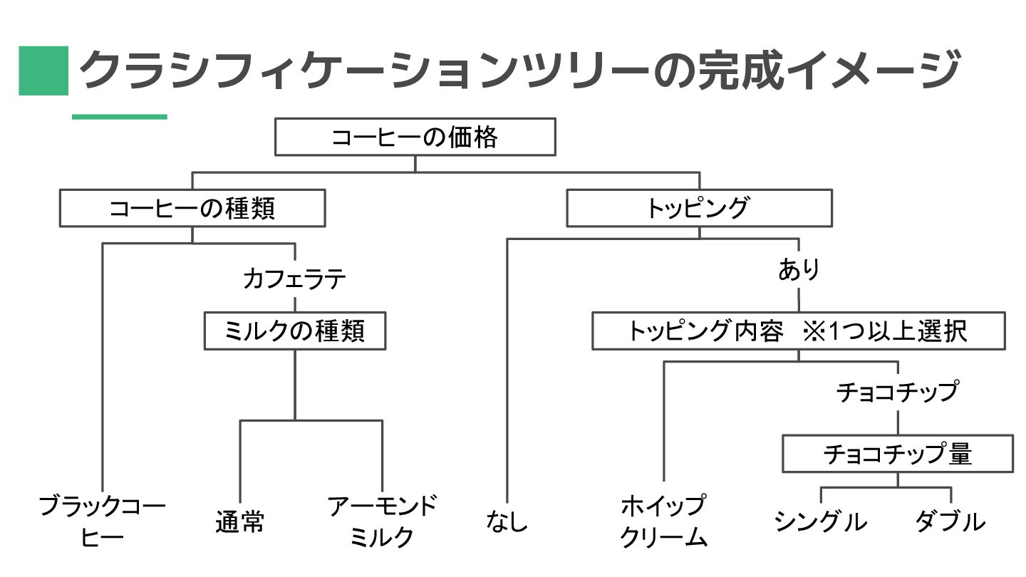 クラシフィケーションツリーの完成イメージ コーヒーの価格 コーヒーの種類 ブラックコー ヒー カフェラテ ミルクの種類 通常 アーモンド ミルク