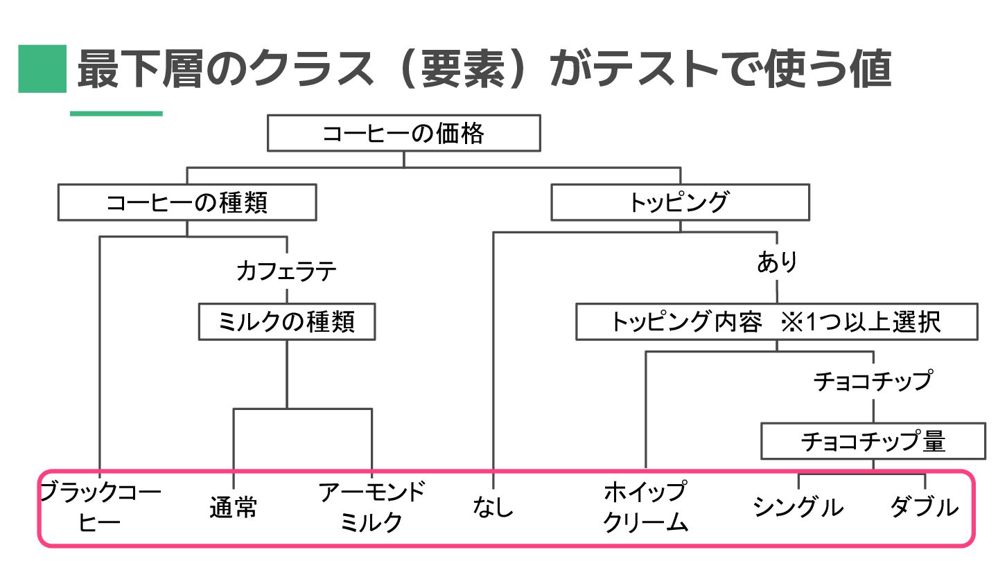 最下層のクラス(要素)がテストで使う値 コーヒーの価格 コーヒーの種類 ブラックコー ヒー カフェラテ ミルクの種類 通常 アーモンド ミルク