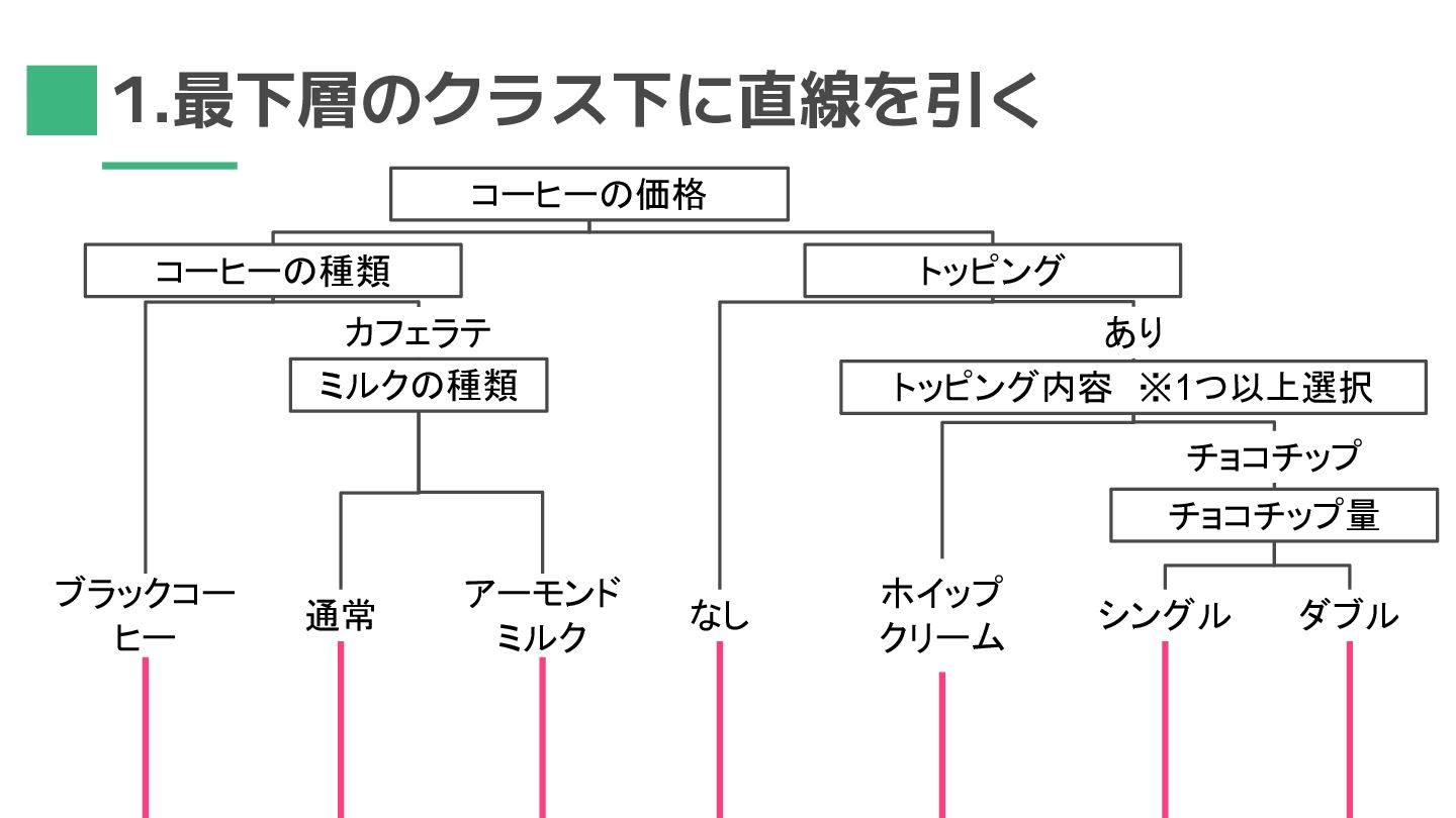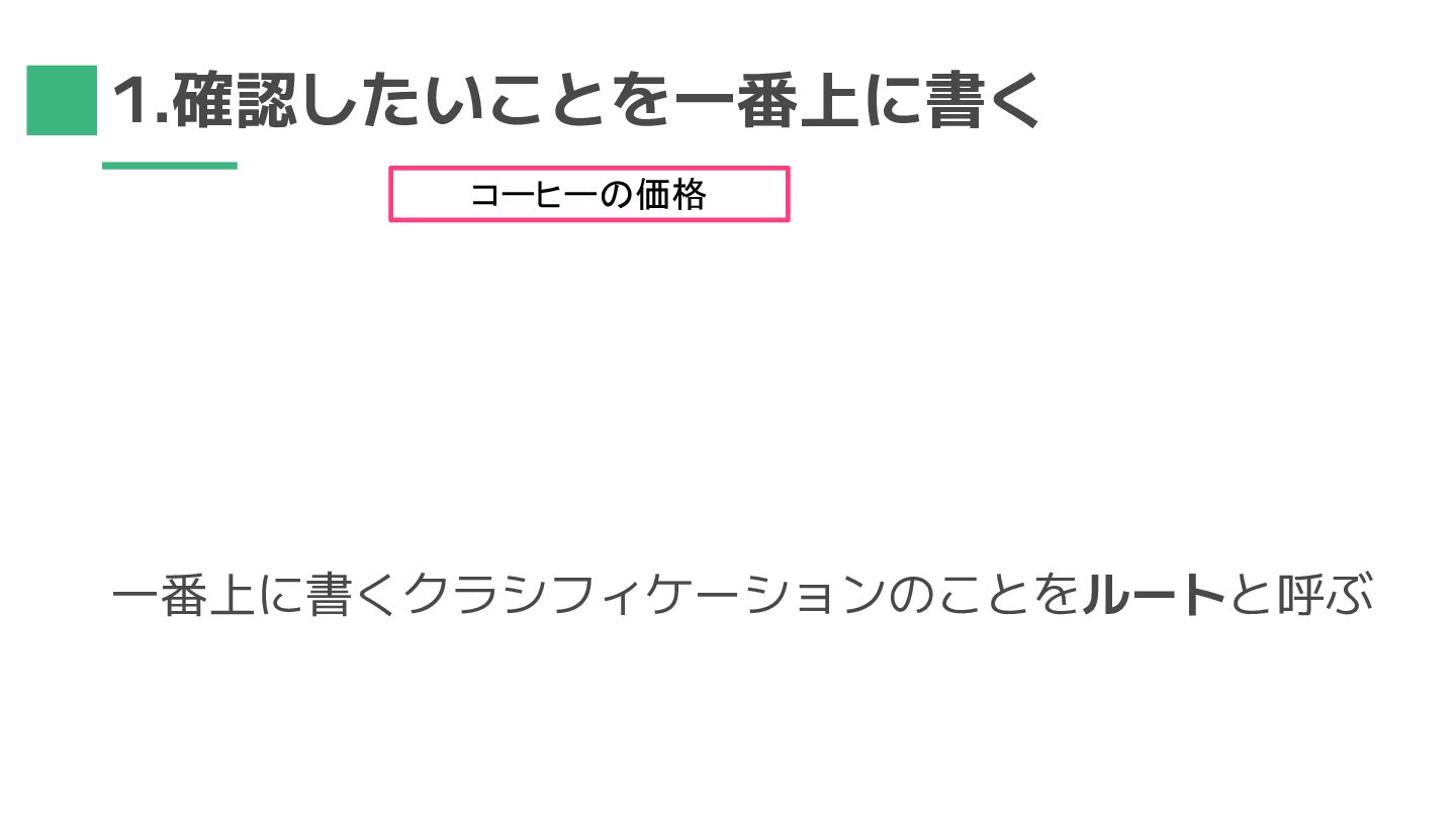 1.確認したいことを一番上に書く コーヒーの価格 一番上に書くクラシフィケーションのことをルートと呼ぶ