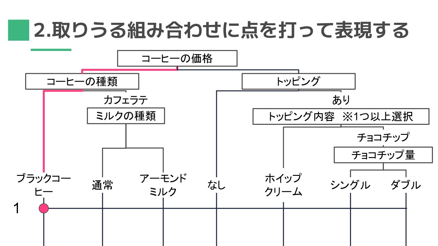 2.取りうる組み合わせに点を打って表現する コーヒーの価格 コーヒーの種類 ブラックコー ヒー カフェラテ ミルクの種類 通常 アーモンド ミルク