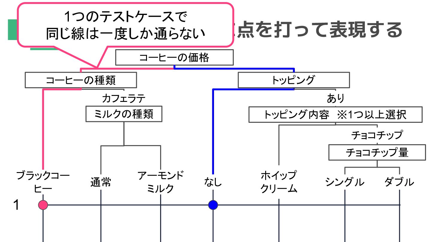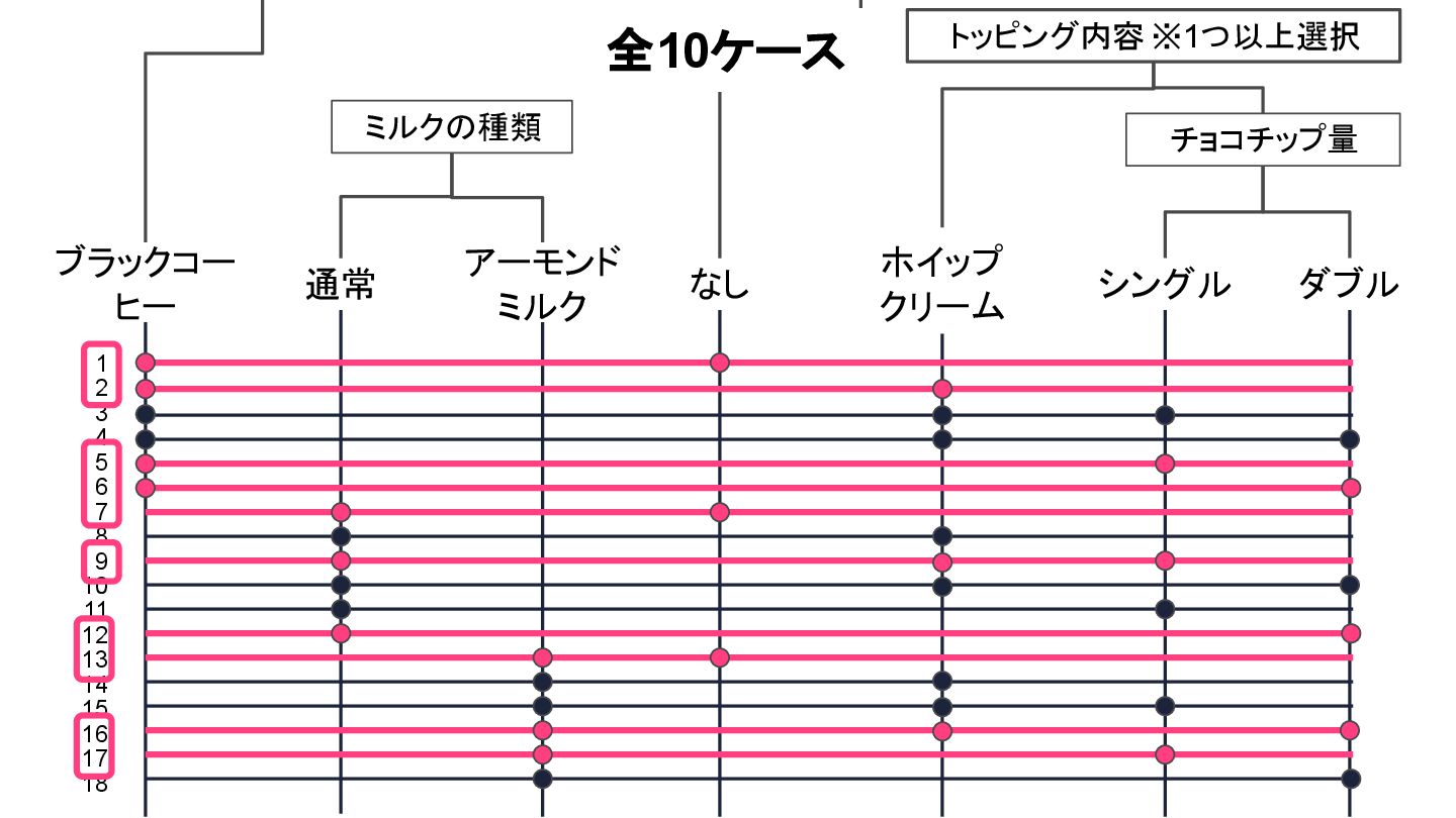 トッピング なし あり トッピング内容 ※1つ以上選択 ホイップ クリーム チョコチップ チョコチップ量 シングル ダブル 1 1つのテストケースで 同じ線は一度しか通らない