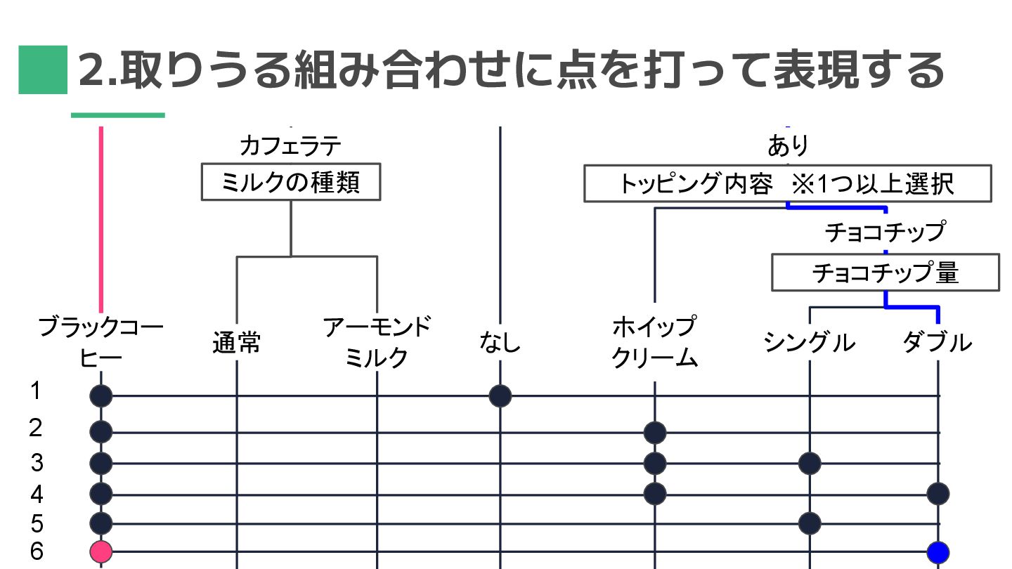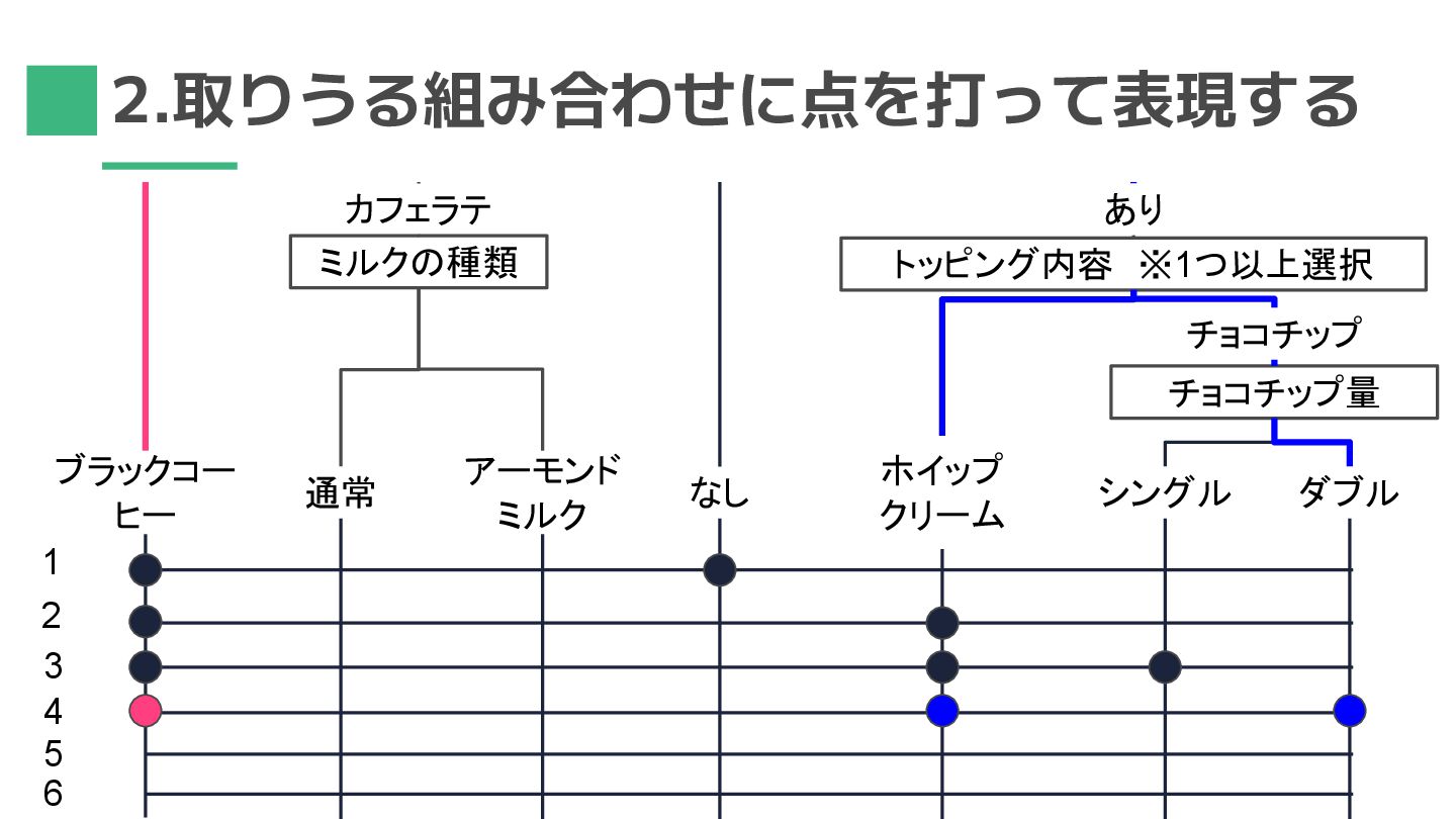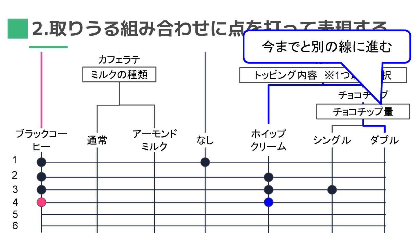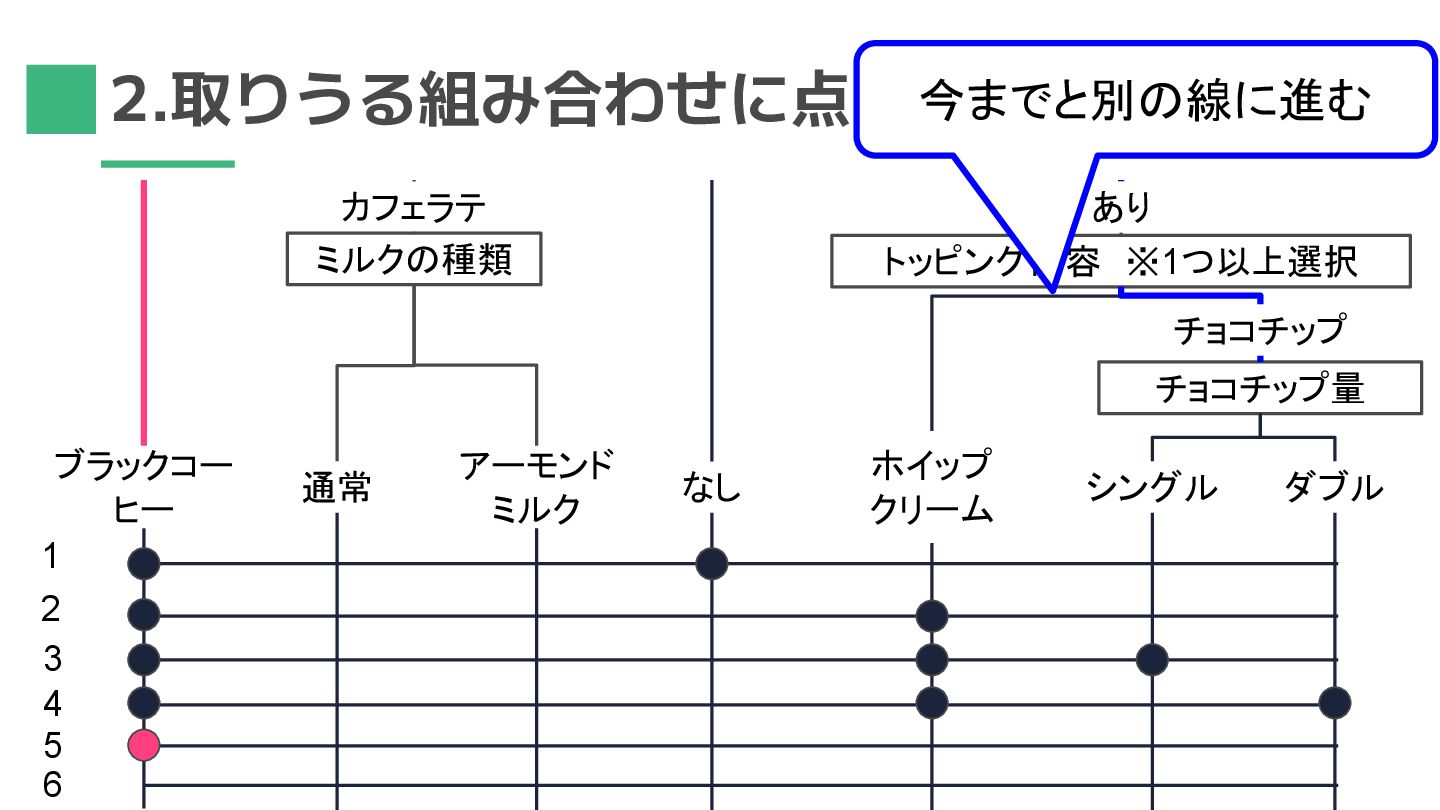 なし あり トッピング内容 ※1つ以上選択 ホイップ クリーム チョコチップ チョコチップ量 シングル ダブル 1 2 3 2.取りうる組み合わせに点を打って表現する 4 5 6 今までと別の線に進む