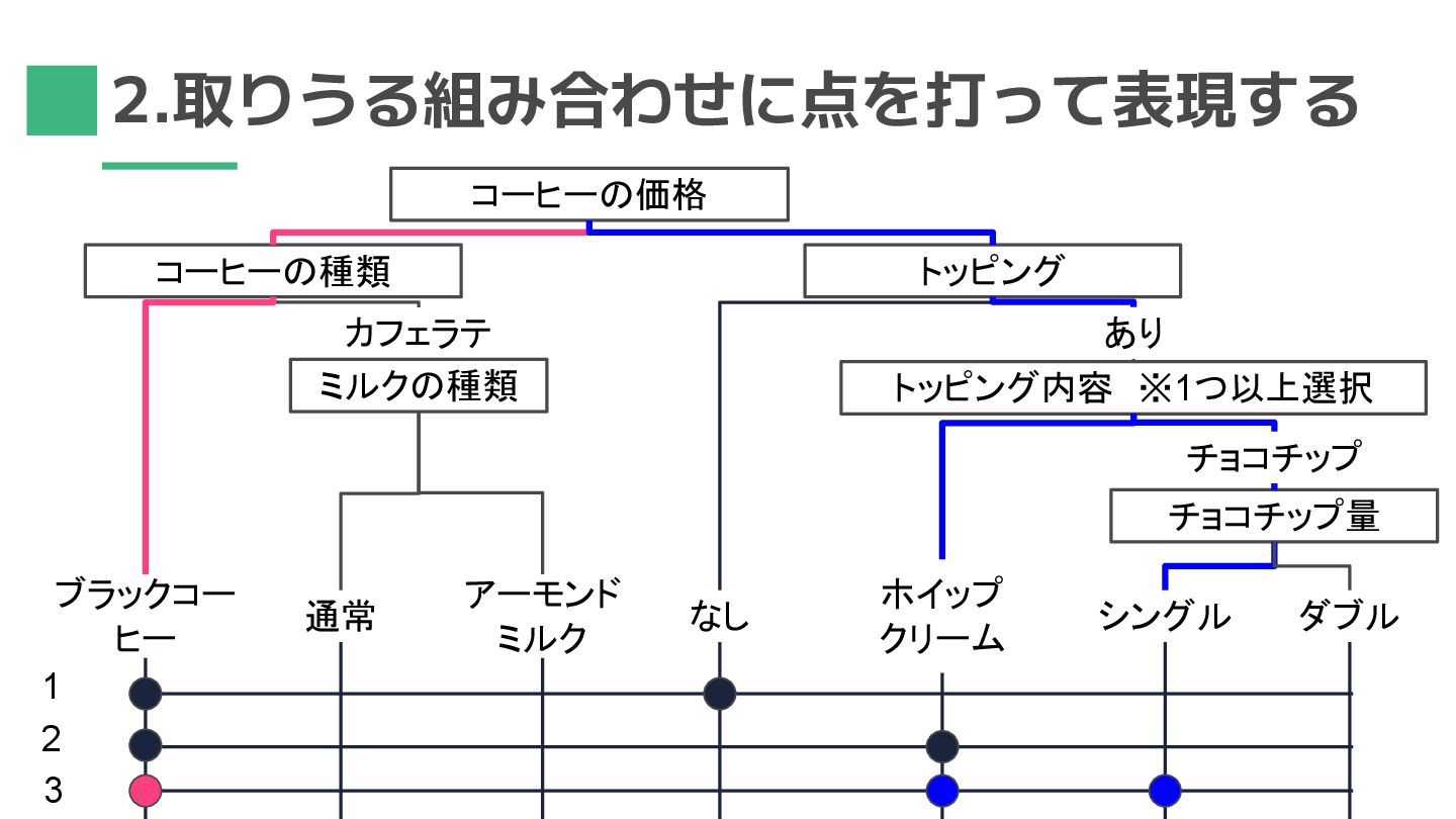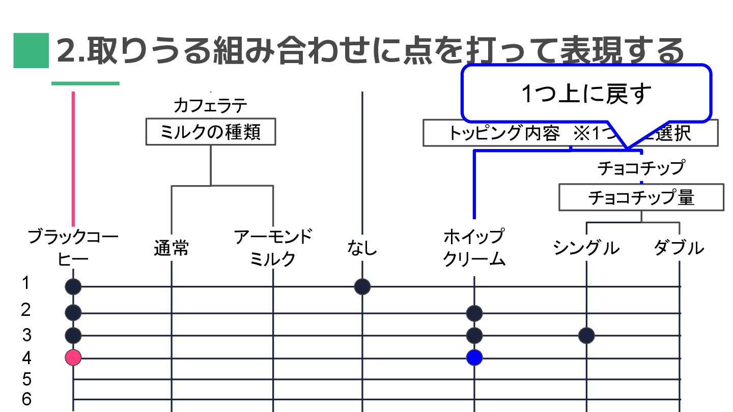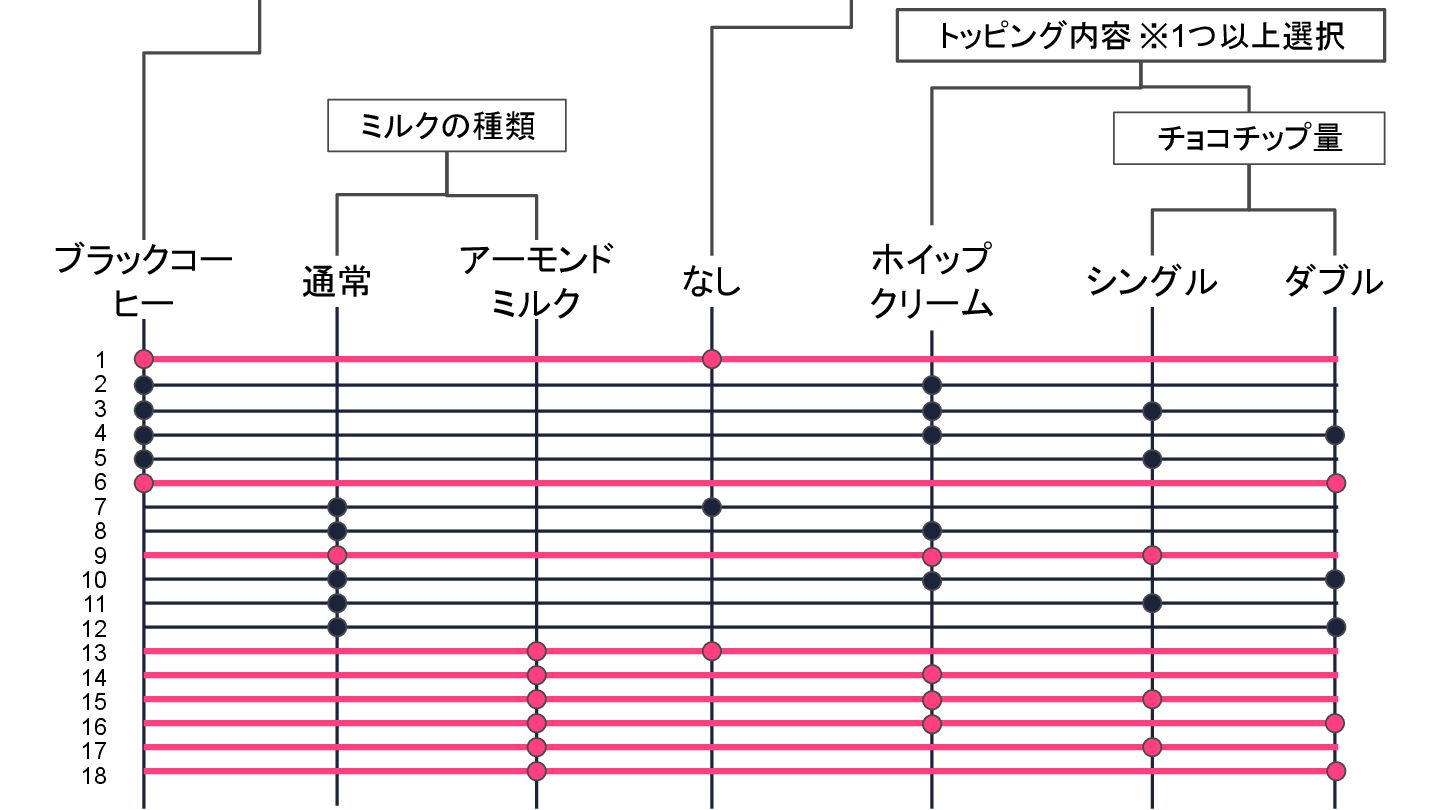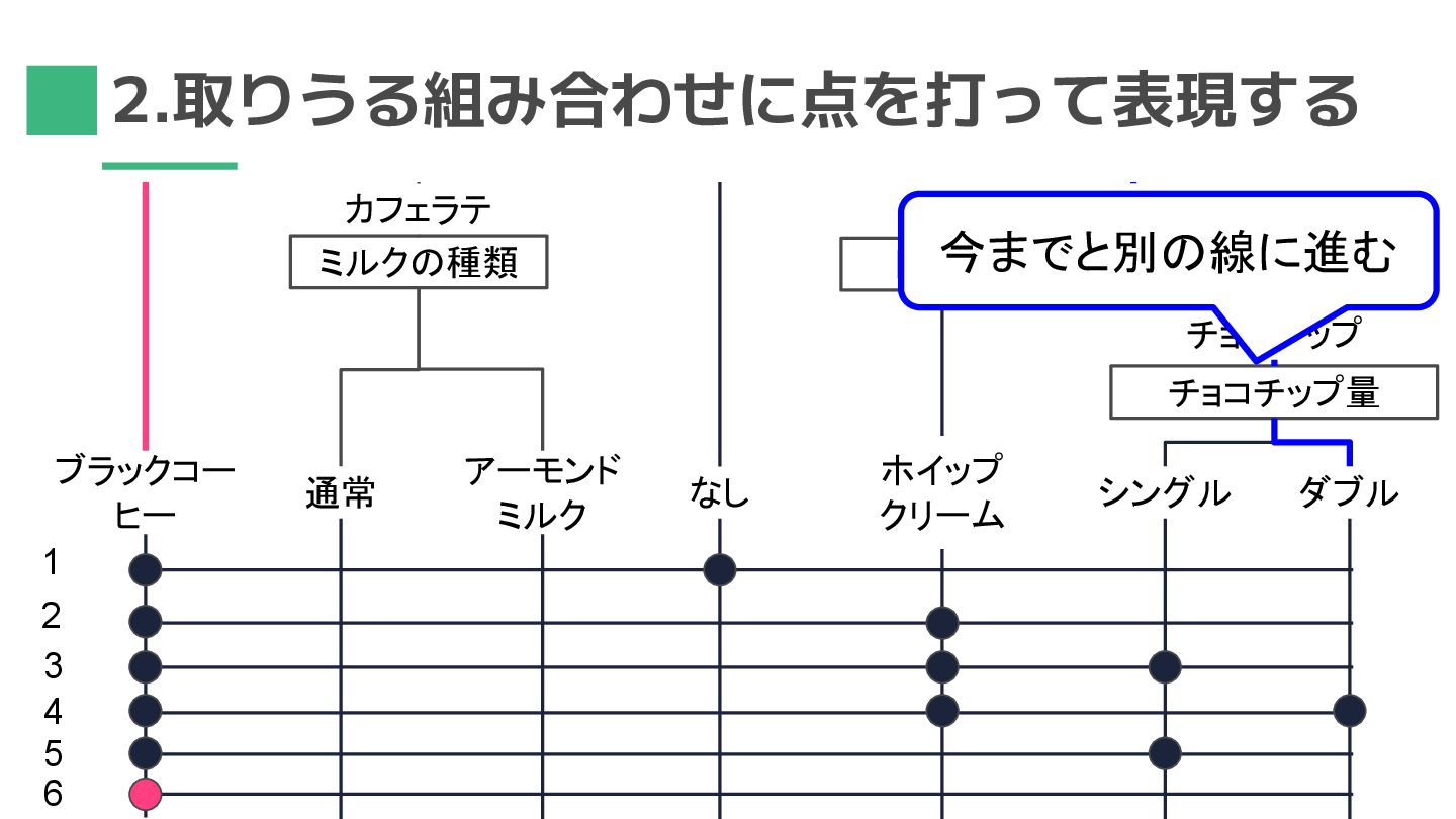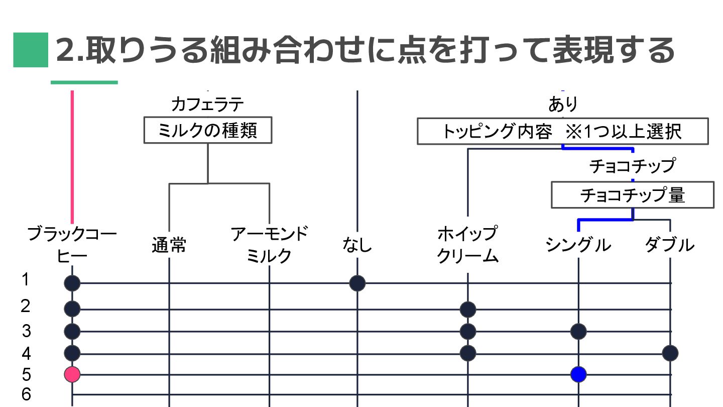 なし あり トッピング内容 ※1つ以上選択 ホイップ クリーム チョコチップ チョコチップ量 シングル ダブル 1 2 3 2.取りうる組み合わせに点を打って表現する 4 5 6 今までと別の線に進む
