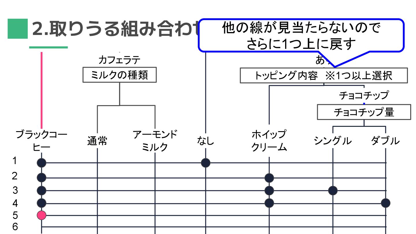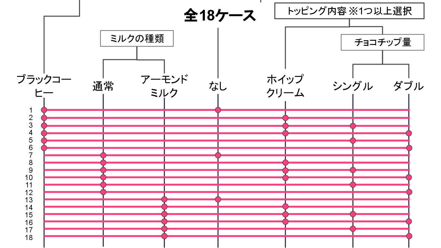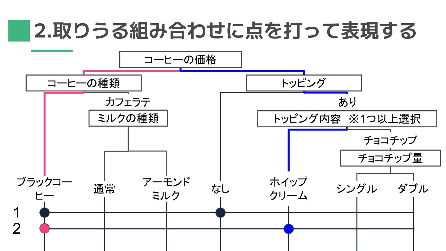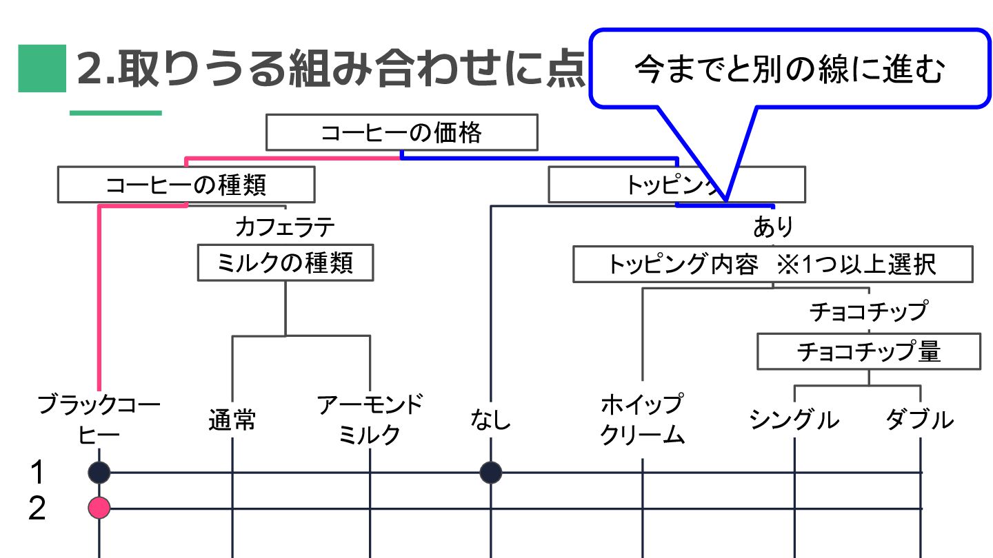 なし あり トッピング内容 ※1つ以上選択 ホイップ クリーム チョコチップ チョコチップ量 シングル ダブル 1 2 3 2.取りうる組み合わせに点を打って表現する 4 5 6 今までと別の線に進む