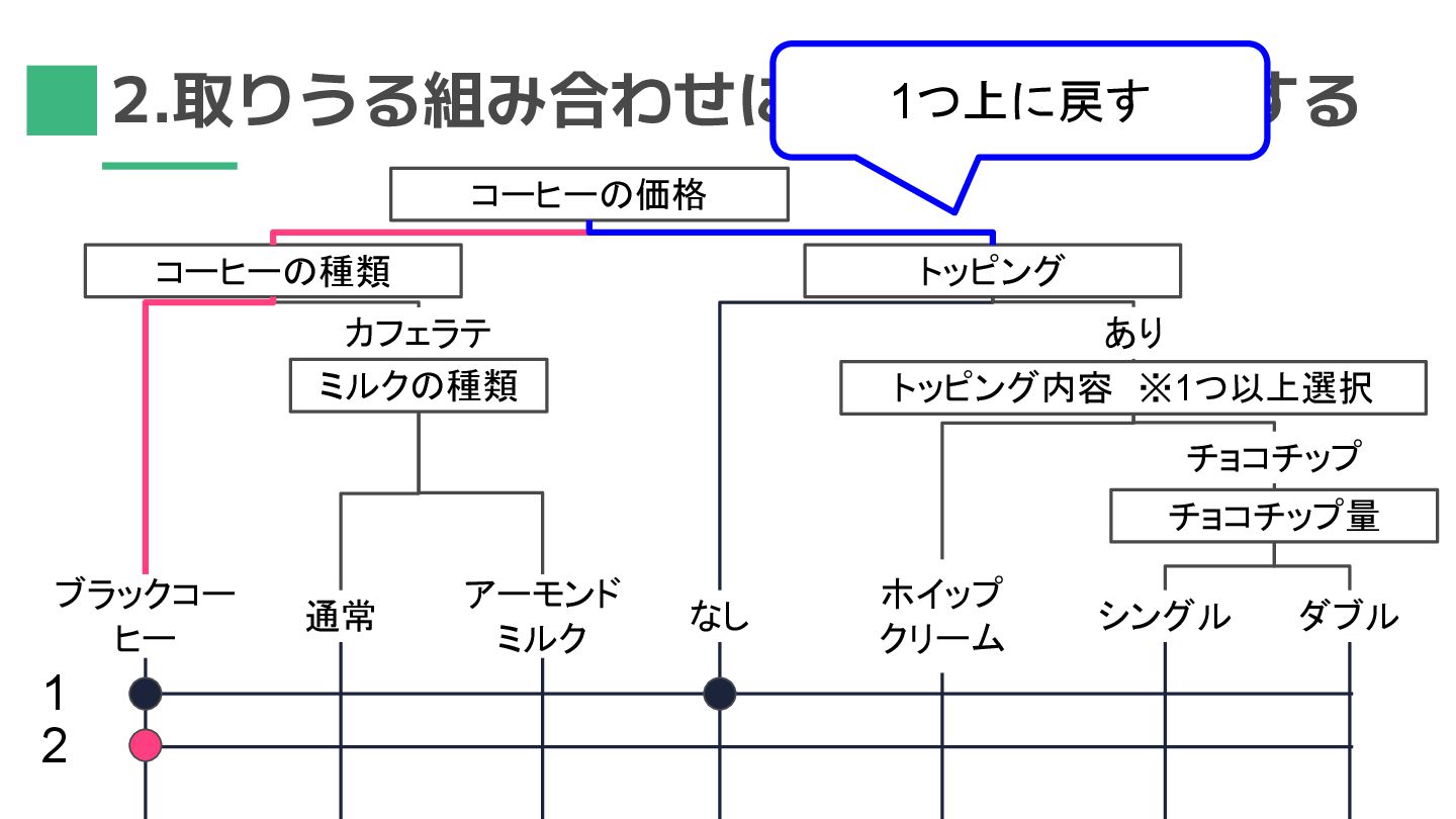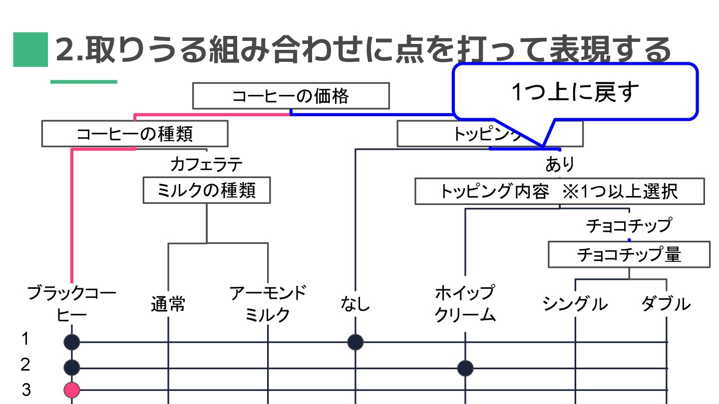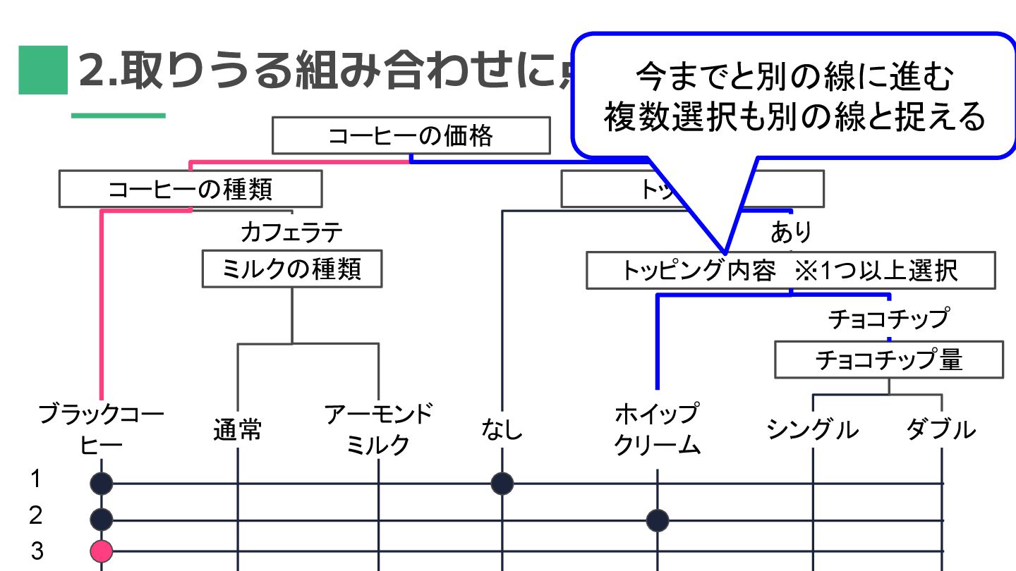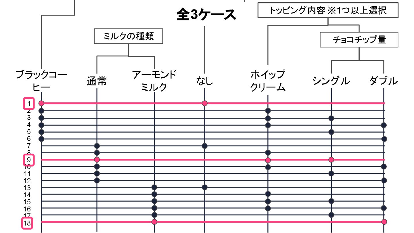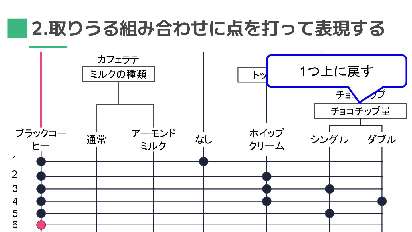 なし あり トッピング内容 ※1つ以上選択 ホイップ クリーム チョコチップ チョコチップ量 シングル ダブル 1 2 3 2.取りうる組み合わせに点を打って表現する 4 5 6 今までと別の線に進む