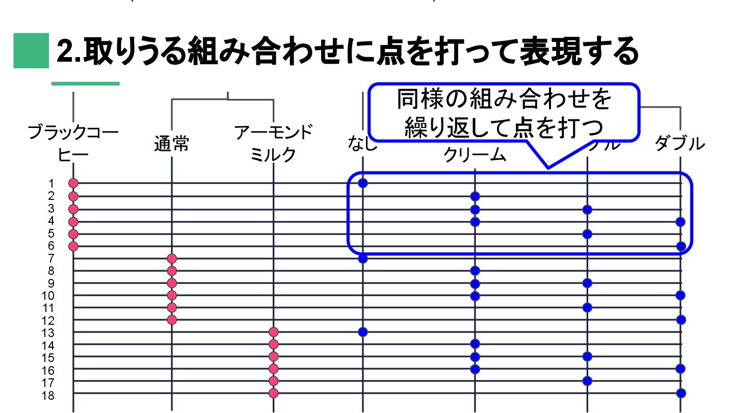 1 2 3 4 5 6 7 8 9 10 11 12 13 14 15 16 17 18 ミルクの種類 チョコチップ量 トッピング内容 ※1つ以上選択 2.取りうる組み合わせに点を打って表現する 同様の組み合わせを 繰り返して点を打つ