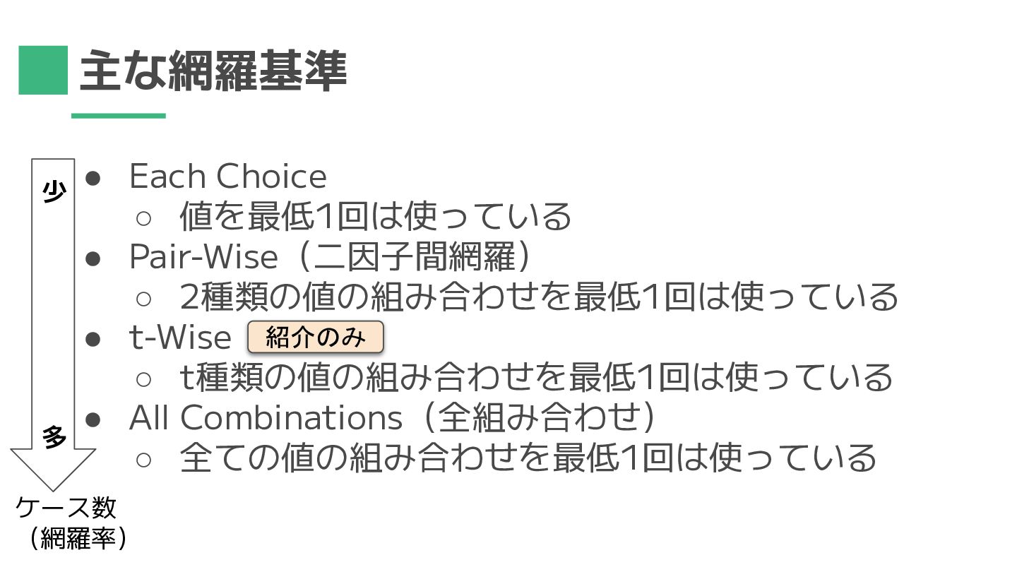 t-Wise ◦ t種類の値の組み合わせを最低1回は使っている • All Combinations(全組み合わせ) ◦ 全ての値の組み合わせを最低1回は使っている 主な網羅基準 少 多 ケース数 (網羅率) 紹介のみ