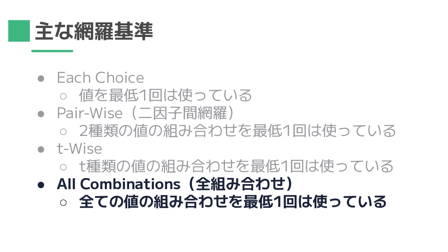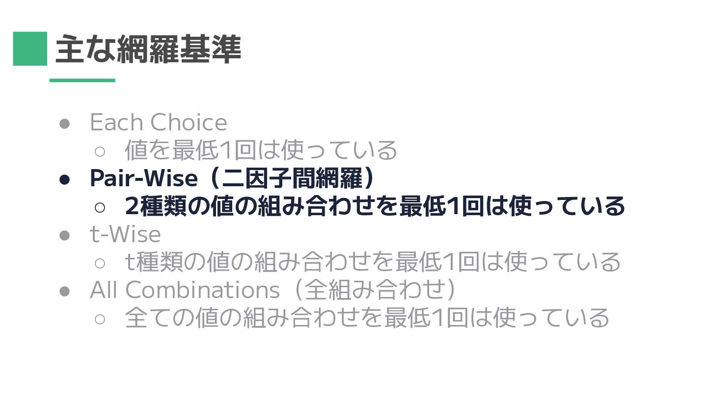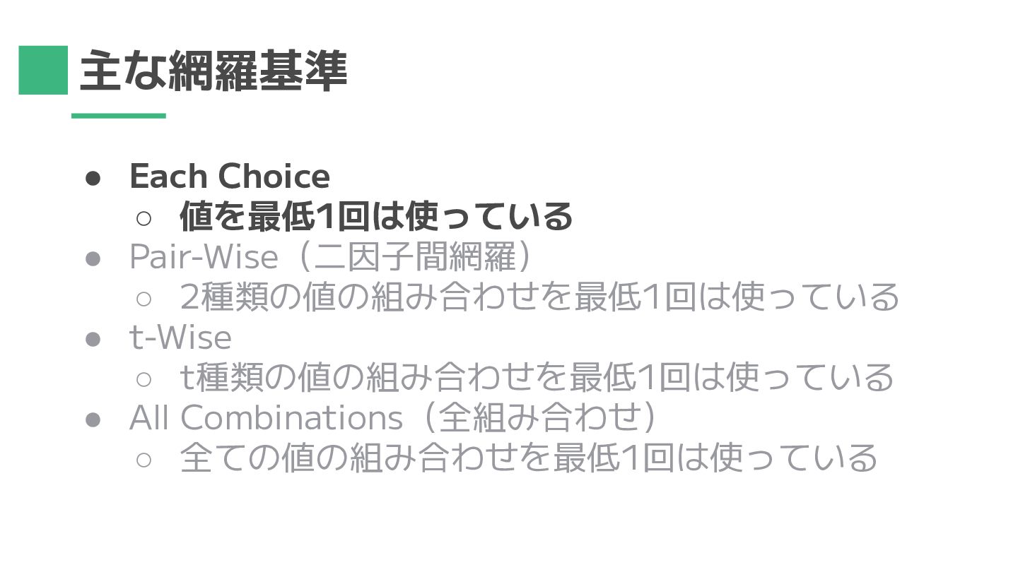 • Each Choice ◦ 値を最低1回は使っている • Pair-Wise(二因子間網羅) ◦ 2種類の値の組み合わせを最低1回は使っている •