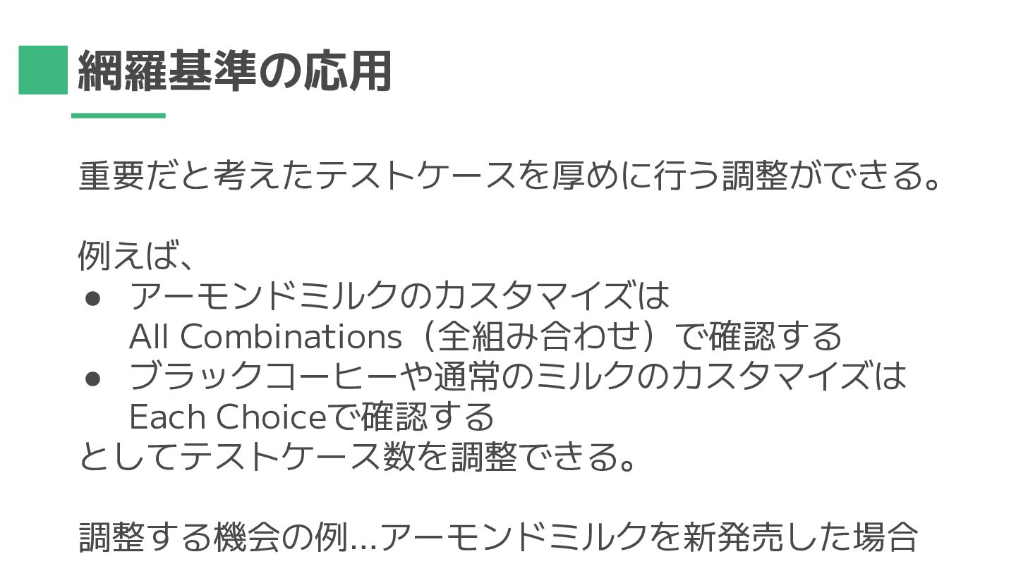 網羅基準の応用 重要だと考えたテストケースを厚めに行う調整ができる。 例えば、 • アーモンドミルクのカスタマイズは All Combinations(全組み合わせ)で確認する • ブラックコーヒーや通常のミルクのカスタマイズは Each