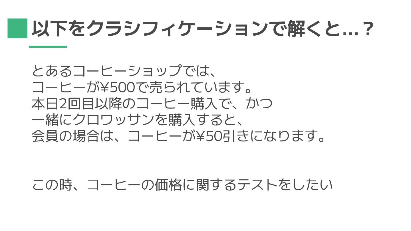 以下をクラシフィケーションで解くと…? とあるコーヒーショップでは、 コーヒーが¥500で売られています。 本日2回目以降のコーヒー購入で、かつ 一緒にクロワッサンを購入すると、 会員の場合は、コーヒーが¥50引きになります。 この時、コーヒーの価格に関するテストをしたい