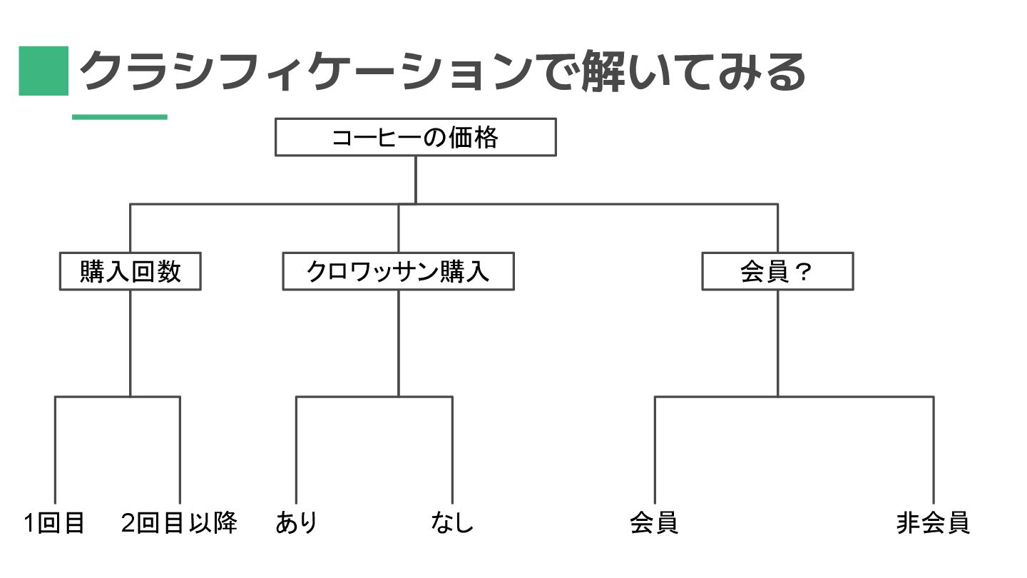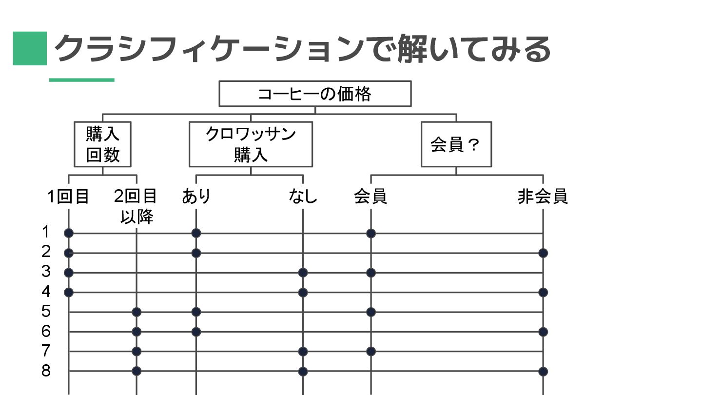クラシフィケーションで解いてみる コーヒーの価格 購入回数 1回目 クロワッサン購入 あり 2回目以降 なし 会員? 会員