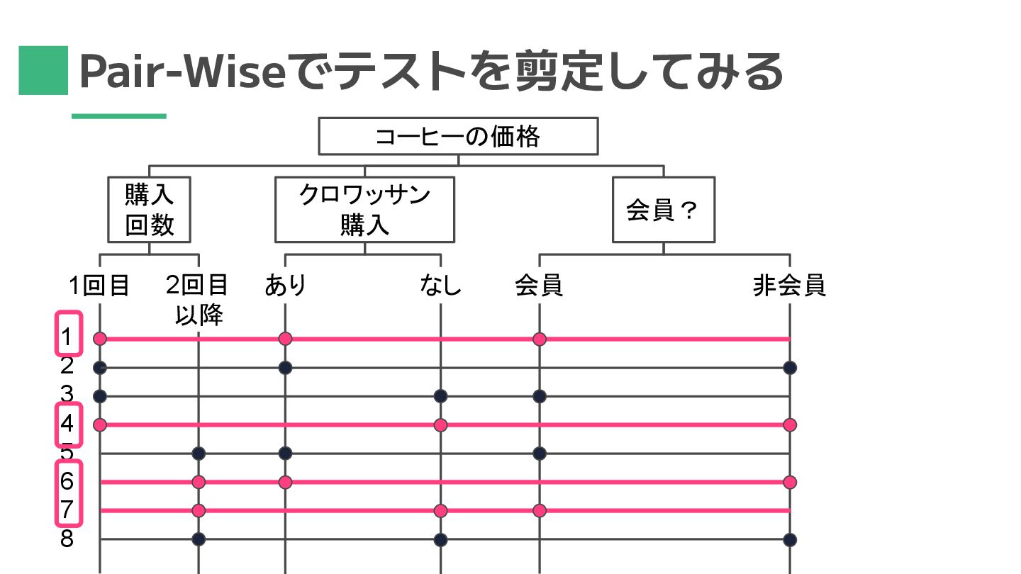 Pair-Wiseでテストを剪定してみる コーヒーの価格 購入 回数 1回目 クロワッサン 購入 あり 2回目 以降