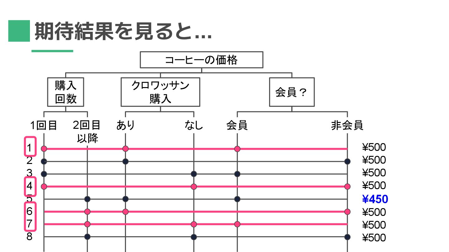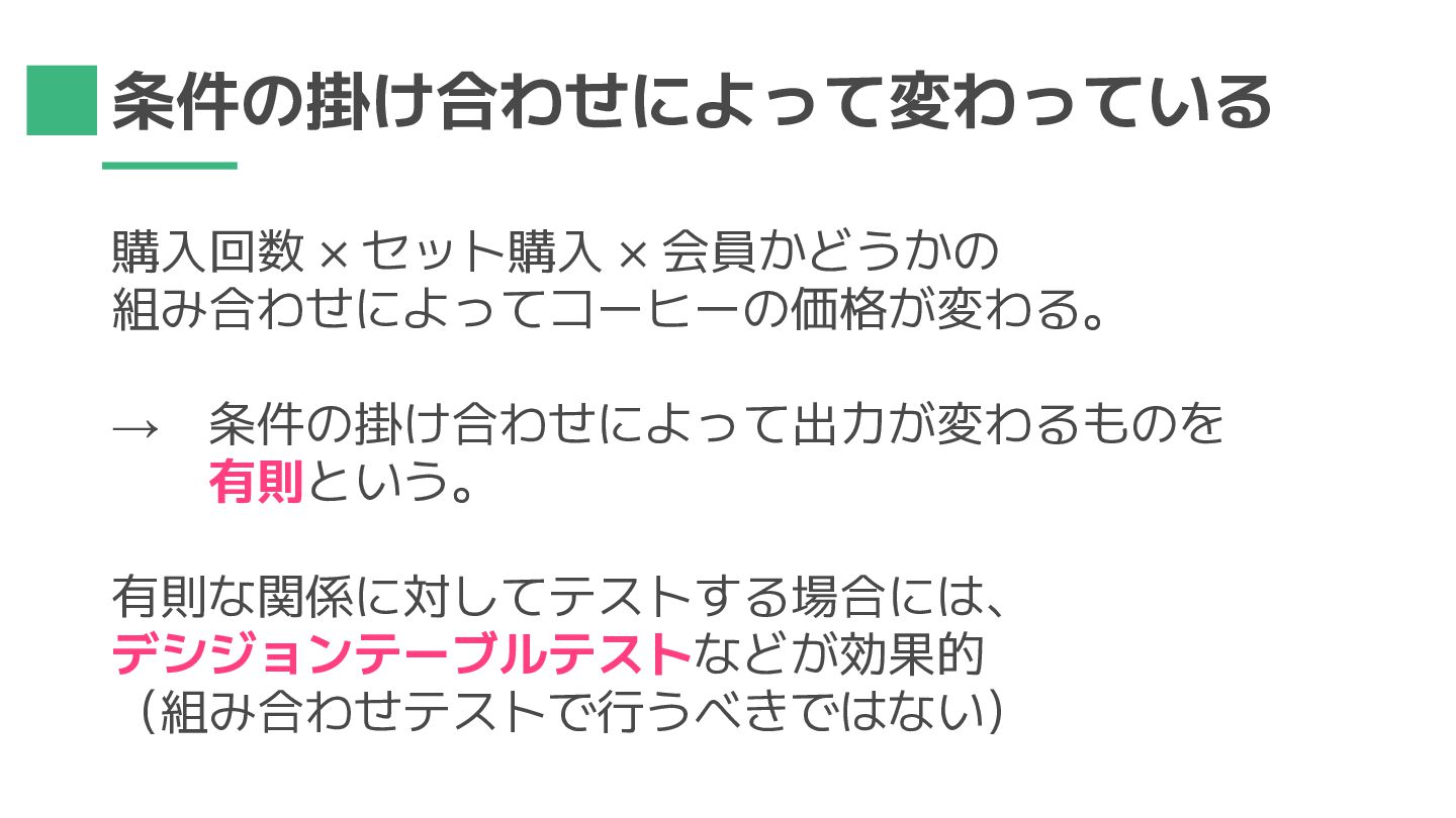 条件の掛け合わせによって変わっている 購入回数 × セット購入 × 会員かどうかの 組み合わせによってコーヒーの価格が変わる。 → 条件の掛け合わせによって出力が変わるものを 有則という。 有則な関係に対してテストする場合には、
