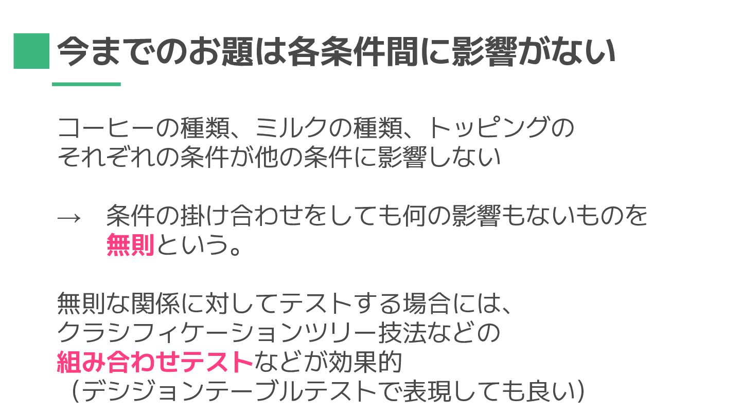 今までのお題は各条件間に影響がない コーヒーの種類、ミルクの種類、トッピングの それぞれの条件が他の条件に影響しない → 条件の掛け合わせをしても何の影響もないものを 無則という。 無則な関係に対してテストする場合には、 クラシフィケーションツリー技法などの 組み合わせテストなどが効果的 (デシジョンテーブルテストで表現しても良い)