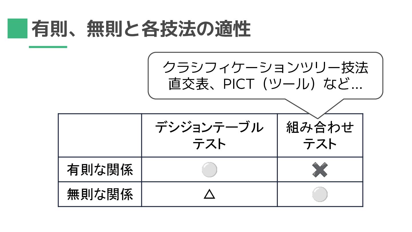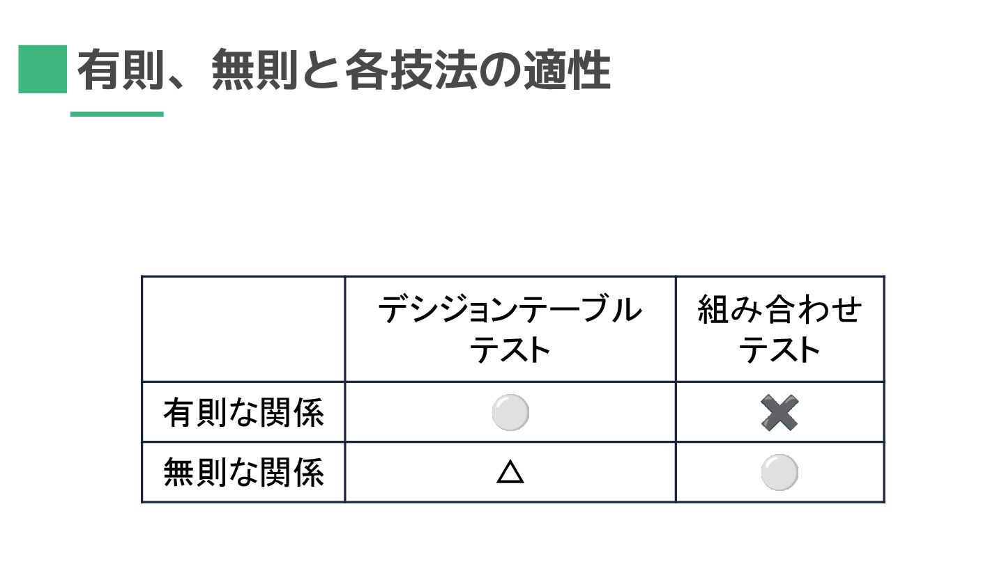 有則、無則と各技法の適性 デシジョンテーブル テスト 組み合わせ テスト 有則な関係 ⚪ ✖ 無則な関係 △