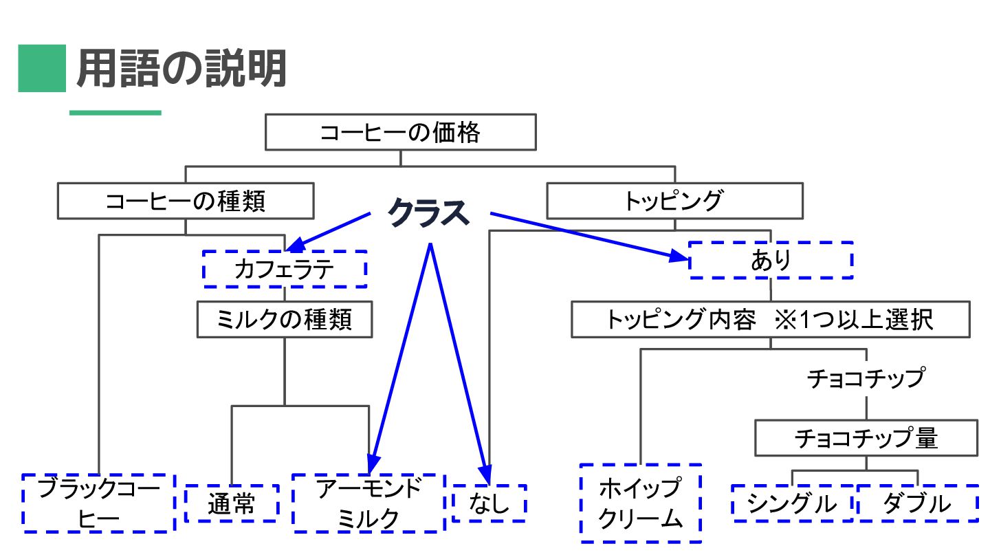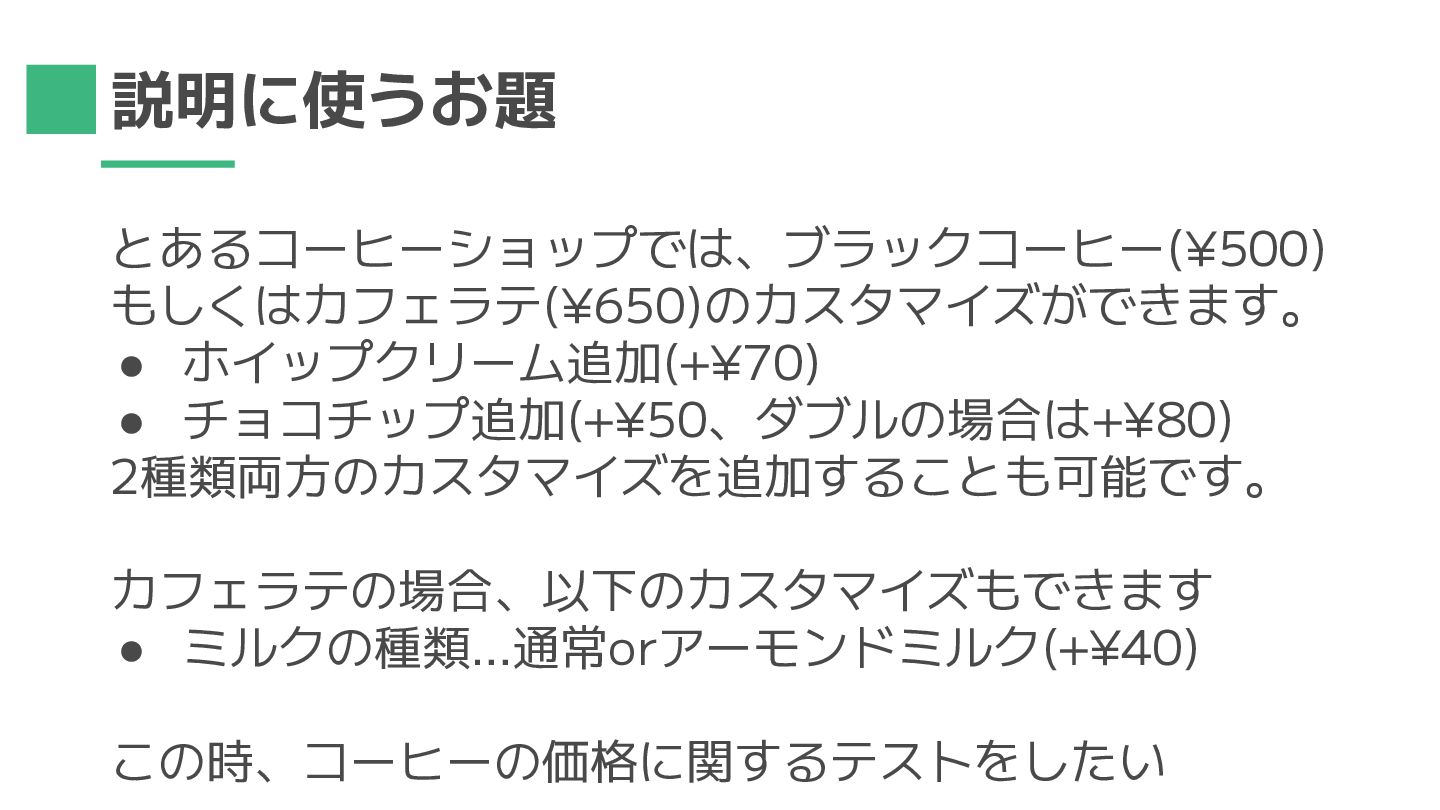説明に使うお題 とあるコーヒーショップでは、ブラックコーヒー(¥500) もしくはカフェラテ(¥650)のカスタマイズができます。 • ホイップクリーム追加(+¥70) • チョコチップ追加(+¥50、ダブルの場合は+¥80) 2種類両方のカスタマイズを追加することも可能です。 カフェラテの場合、以下のカスタマイズもできます •