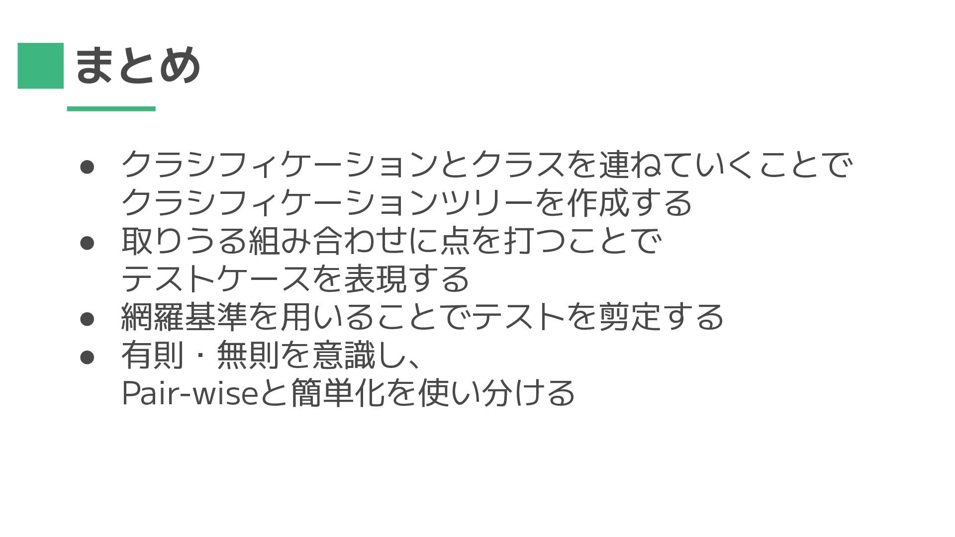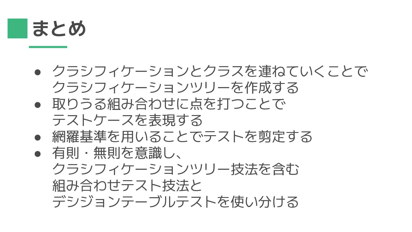 まとめ • クラシフィケーションとクラスを連ねていくことで クラシフィケーションツリーを作成する • 取りうる組み合わせに点を打つことで テストケースを表現する • 網羅基準を用いることでテストを剪定する •
